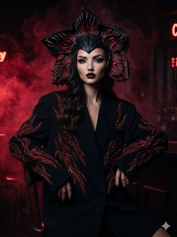 : Суперреалистичный крупный план девушки, сидящей на высоком барном стуле. Она в черном оверсайз пиджаке, который свободно обвивает ее фигуру, создавая эффект дерзкой моды, красным бисером вышиты какбы порезы на пиджаке - стиль футуризм. Макияж в стиле готического гламура: глубокие темные стрелки, губы насыщенного бордового оттенка, слегка матовые, идеальные контуры лица, акцент на бледной коже. Главный акцент — на шляпе, вдохновленной демогорганом из 'Очень странных дел'. Шляпа черного цвета с красными элементами, напоминающими шипы и когти, будто она наполовину расправлена, как пасть демогоргана. Детали шляпы добавляют устрашающий и одновременно изысканный эффект. Фон — темный, с красным неоновым дымом, создающим мрачную атмосферу. Мягкое освещение подчеркивает лицо и шляпу, оставляя остальную часть композиции в полумраке. Цветовая палитра: черный, красный и темно-бордовый, с акцентами неона. Сцена ощущается как стильная и загадочная fashion-съемка с элементами ужаса и мистики. Камер