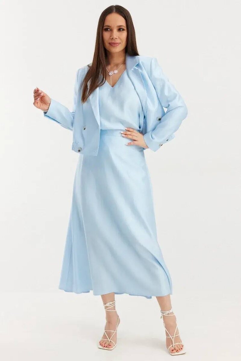 костюм-тройка из смесовой вискозы с деликатным блеском нежно переливается на свету, даря дополнительную свежесть в портретной зоне. Трендовый жакет-бомбер и юбка - на подкладе. Внутри топ с V-вырезом. Все детали костюма прекрасно замиксуются с другими вещами из вашего гардероба! Хорош и для будней, и для праздничных событий, носим и с босоножками на шпильке, и с кедами! Размеры 46-52. Цена 23500