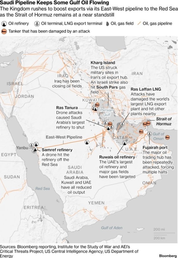 Трубопровод East-West, также известный как Petroline, который пересекает Аравийский полуостров и используется для экспорта саудовской нефти через Красное море на терминал Янбу, был атакован БПЛА, сообщила Financial Times. Атака пришлась на одну из насосных станций днем 8 апреля В настоящее время специалисты проводят оценку нанесенного ущерба. Данный трубопровод протяженностью 1,2 тыс. км приобрел для Саудовской Аравии жизненно важное значение после того, как судоходство в Ормузском проливе было остановлено UDP: проход нефтяных танкеров через Ормузский пролив приостановлен из-за нарушения Израилем перемирия @geonrgru | 🇷🇺 MAX | sponsr.ru