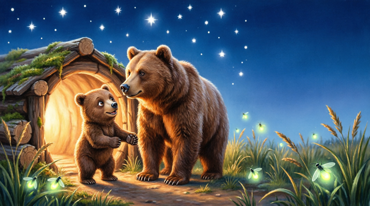 Медвежонок Топ жил в большой берлоге. Днём в берлоге было хорошо. Светло, тепло, пахло мёдом. А ночью мама гасила свет. И тогда всё пропадало. Стол пропадал и полка. Любимый горшок с мёдом тоже пропадал. Был и нет. Топ залезал под одеяло с головой и лежал тихо-тихо. - Мама, - шептал он. - Там темно. - Там ночь, - говорила мама. - Ночь это страшно? - Ночь это когда все спят. Топ высунул нос из-под одеяла. Темнота никуда не делась. - А кто живёт в темноте? - спросил он. - Хочешь посмотреть? Топ не хотел, но сказал «да». Мама взяла его за лапу, и они вышли из берлоги. Ой. Топ остановился. Над лесом было столько всего. Маленькие белые огоньки высоко-высоко. Один, два, три не сосчитать. - Что это? - спросил Топ. - Звёзды. - Они всегда там? - Всегда, просто днём их не видно, солнце мешает. Топ смотрел вверх. Шея уже устала, а он всё смотрел. Потом в траве что-то мигнуло. Раз. Два. Три. - Мама! - Топ прыгнул к ней. - Там кто-то есть! - Светлячки, - сказала мама. - Они летают ночью. У каждого