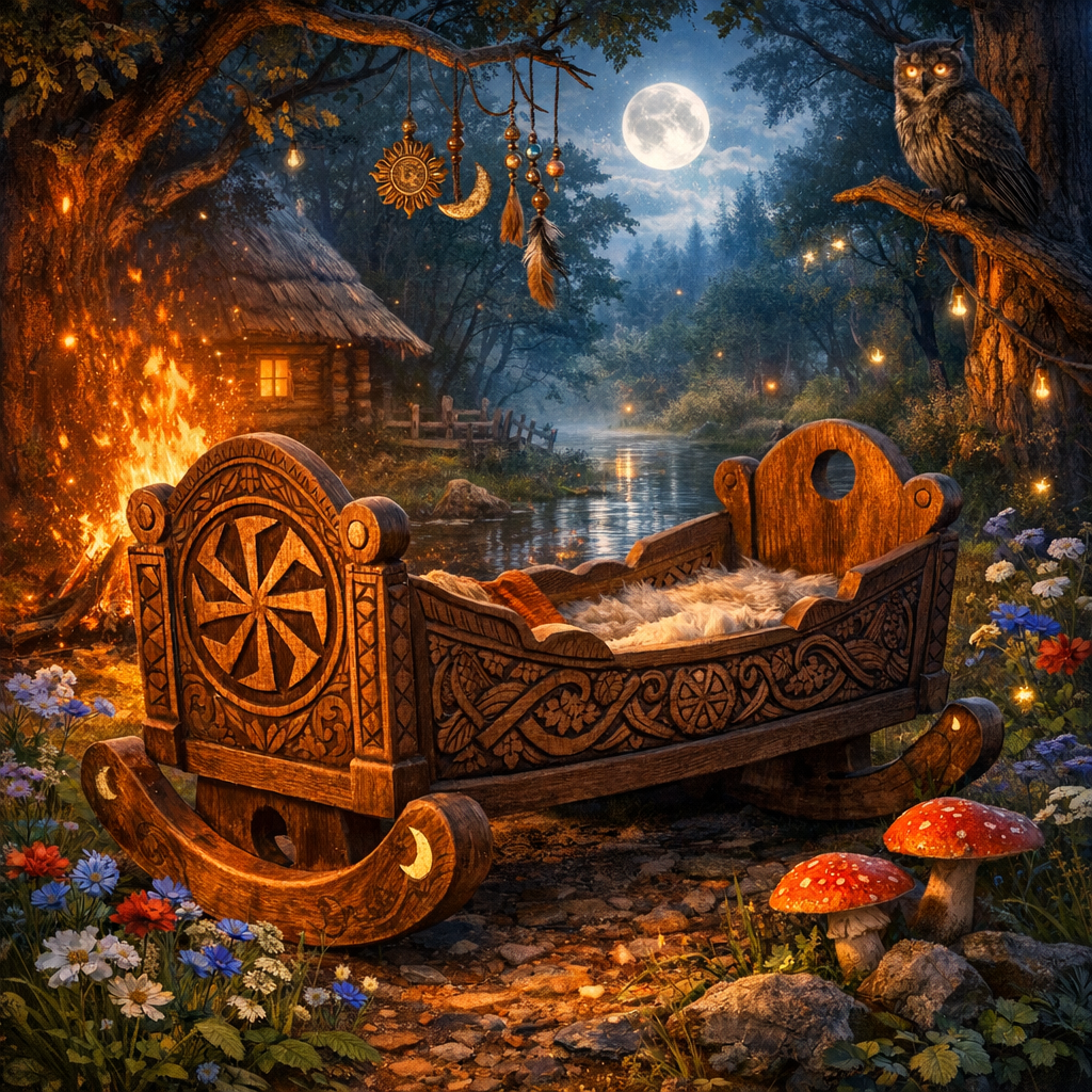 Колыбель — территория ночи. Ребёнок просыпается, плачет, пугается. В традиции много сюжетов про ночных сущностей, «давку», «криксу», «лихо», про то, что «кто-то ходит». Современный человек посмеётся, а предок скажет: смейся, пока сам не столкнулся с бессонными ночами и детскими судорогами.