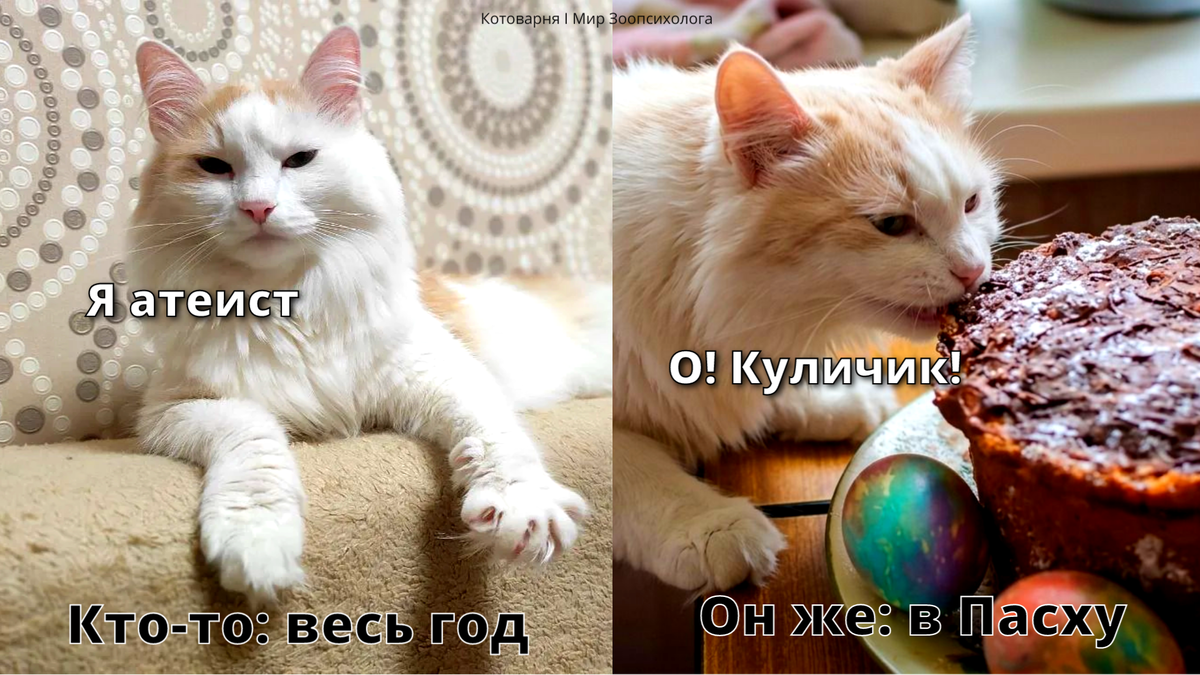 Например, в Новый год можно повалять елку и поесть вкусностей! В Масленицу — полакомиться блинами. А в Пасху, помимо праздничных блюд, на столе появляется так много интересных вещичек... Есть у котиков и еще один повод, чувствовать в Пасху волнение души👇 Слышали ли вы красивую легенду о