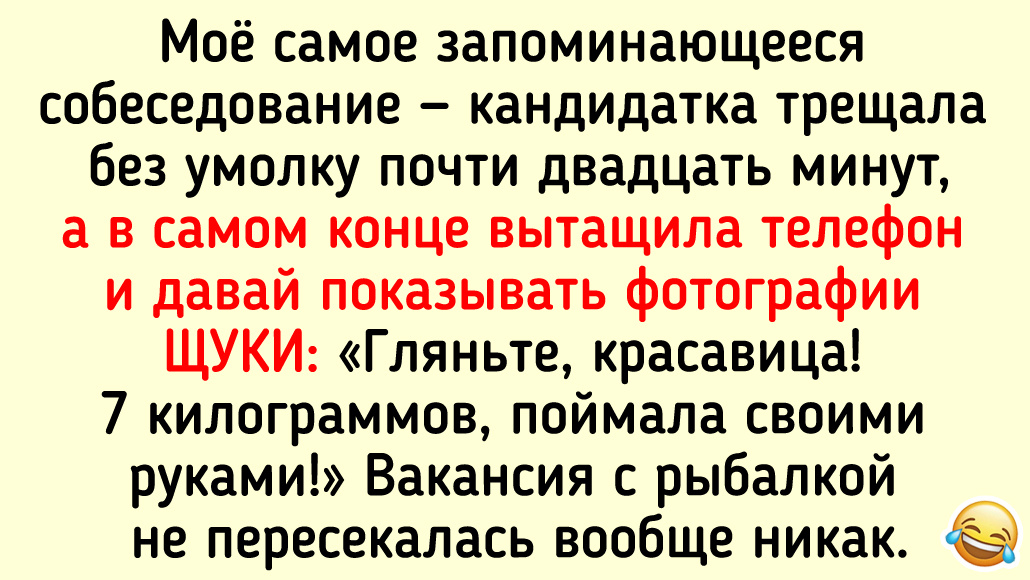 Моё самое запоминающееся собеседование — кандидатка трещала без умолку почти двадцать минут, а в самом конце вытащила телефон и давай показывать фотографии ЩУКИ: «Гляньте, красавица! 7 килограммов, поймала своими руками!» Вакансия с рыбалкой не пересекалась вообще никак. © beta_juiletta На собеседовании одна девушка с порога сообщила, что все её бывшие молодые люди трудятся в нашей фирме, и призналась: она просто мечтает посмотреть на их лица в тот момент, когда выйдет на работу. Всё это уложилось в первые три минуты разговора. Дело происходило много лет назад, в то время когда заполнять резюме мне было практически нечем, и приходилось разбавлять его «водой» — длинными перечнями умений и личных качеств. Взял и скопировал из чужого резюме: «стрессоустойчивость, инициативность, старательность, хорошая память» и прочее в том же духе. Меня пригласили на встречу. Познакомился с HR и директором, сидим, разговариваем. Директор: «У вас тут упоминается память. Скажите, как меня зовут?» Я: «Андр