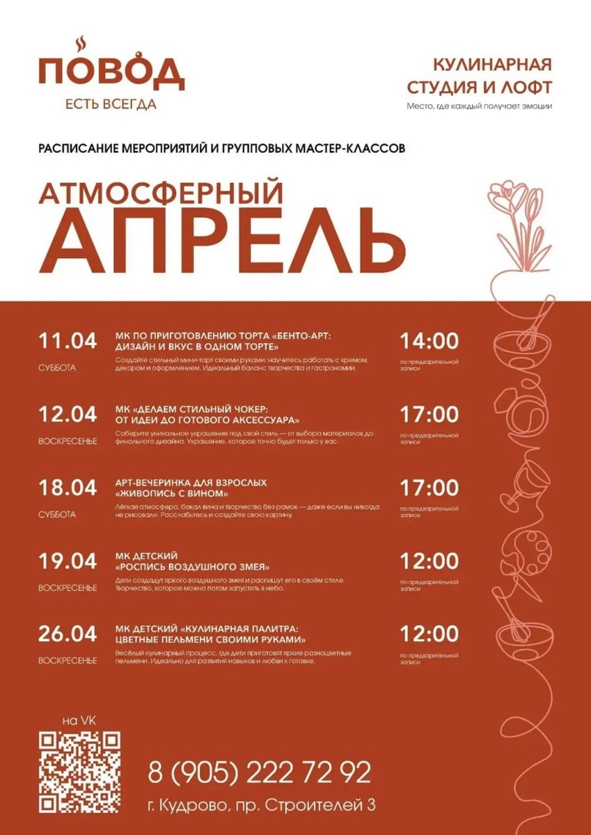 » Весна — идеальное время, чтобы попробовать что-то новое, провести время с близкими и подарить себе эмоции 💛 Мы подготовили серию мастер-классов для детей и взрослых: — готовим стильные бенто-торты — создаём украшения своими руками — рисуем с вином в лёгкой атмосфере — устраиваем творческие занятия для детей — лепим яркие пельмени всей семьёй Каждое мероприятие — это не просто мастер-класс, а полноценный опыт: эмоции, общение, творчество и отдых ✨ 📍 Уютное пространство в Кудрово 📅 Даты: 11, 12, 18, 19 и 26 апреля ⚡️ Количество мест ограничено — группы небольшие Не откладывайте — самые интересные форматы разбирают первыми 👉 Подробности и запись: vk.com/povod_event_kudrovo