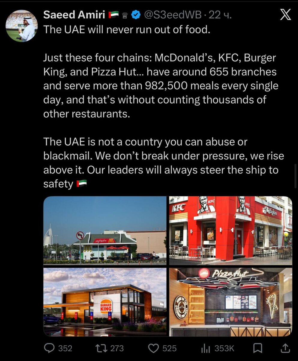 🍔⚡️ Патриотический текст про несгибаемость Эмиратов звучит эффектно, но особенно хорошо на фоне McDonald’s, KFC, Burger King и Pizza Hut, которые там уже почти как элементы национальной идентичности. А встречи лидеров с подданными в ТЦ только добавляют этому всему фирменного восточного блеска. Подпишитесь на канал