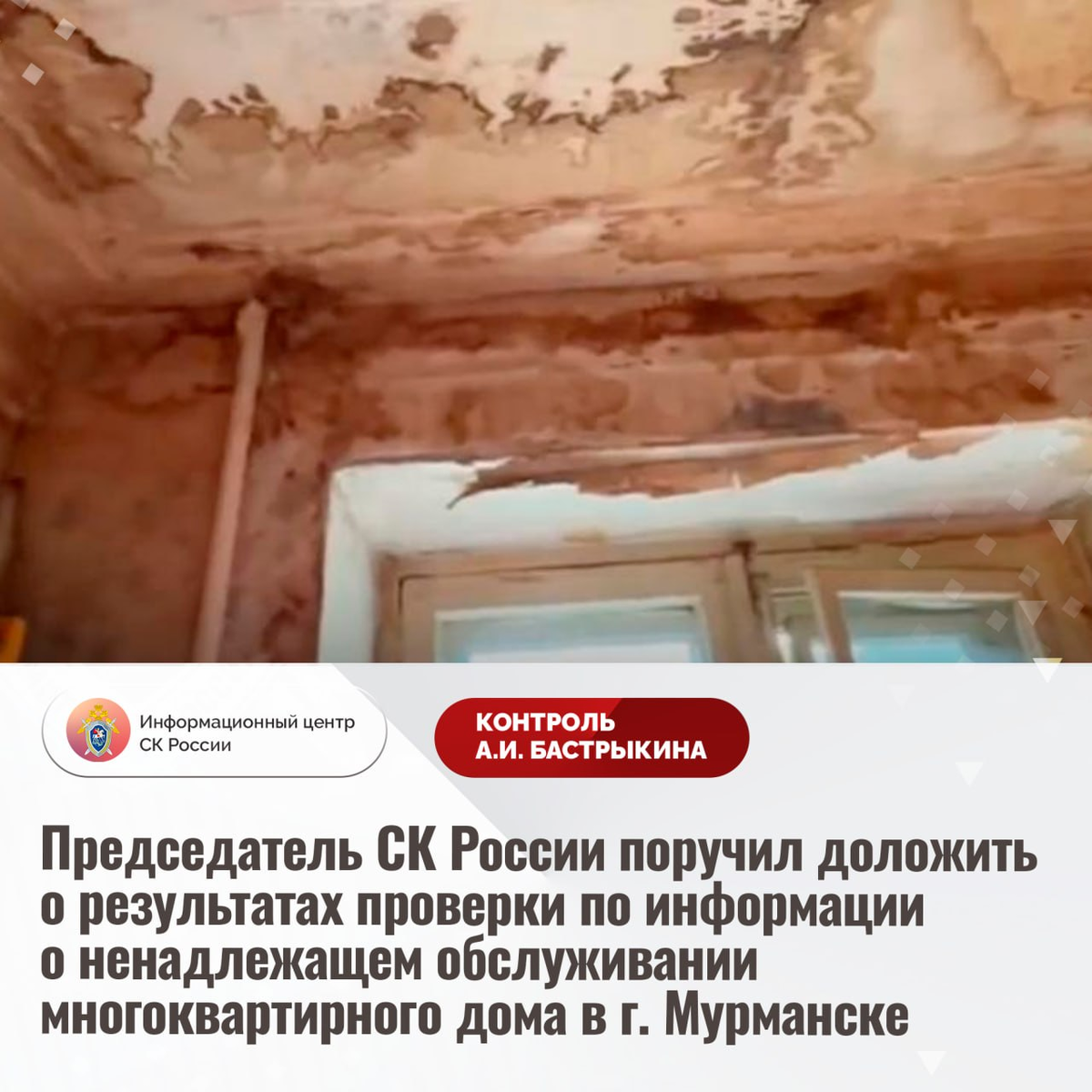 Председатель СК России поручил доложить о результатах проверки по информации о ненадлежащем обслуживании многоквартирного дома в г. Мурманске В социальной сети сообщается о ненадлежащем обслуживании многоквартирного дома на улице Подгорной в городе Мурманске. Длительное время здание 1961 года постройки находится в непригодном состоянии: инженерные системы неисправны, нарушена целостность кровли, из-за постоянной сырости распространилась плесень, систематически происходя замыкания электропроводки. Многочисленные обращения жильцов в компетентные органы результатов не принесли. Указанная ситуация освещалась в социальной сети. В СУ СК России по Мурманской области организована процессуальная проверка. Председатель Следственного комитета Российской Федерации Александр Иванович Бастрыкин поручил руководителю СУ СК России по Мурманской области Андрею Александровичу Ефремову доложить о предварительных и окончательных результатах процессуальной проверки. Исполнение поручения, а также ход процес