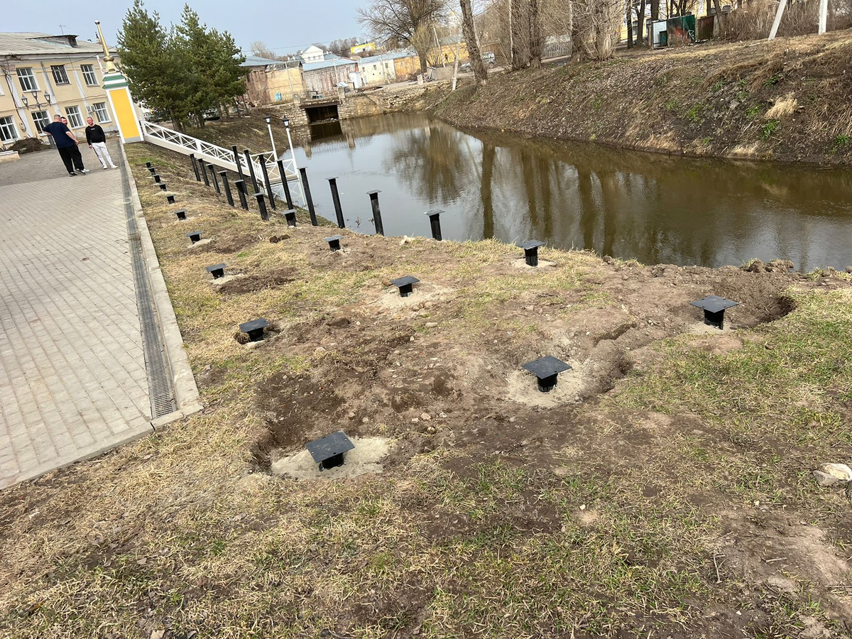 С примерами реальных объектов Сваи для строительства у воды и на воде используют повсюду: строят пирсы и причалы, мостики и дорожки на воде, кафе, лодочные сараи и сап-станции, гостиничные коттеджи и индивидуальные жилые дома. Чаще это винтовые сваи, но при строительстве у воды или в зоне подтопления применяют и железобетонные забивные. В этой статье мы покажем разные технологии монтажа свай в воду или рядом и добавим примеры реальных проектов «Королёвского завода свай». В основном это будут винтовые сваи, но в конце покажем крупный объект на забивных сваях. Фундамент из винтовых свай можно возвести даже на очень крутом берегу, если не будет ограничений для работы техники. Техника — это чаще всего сваекрут на гусеничном ходу, но также может применяться ямобур. У ямобура больше вылет стрелы, а еще он может крутить сваи даже в грунт с большим количеством камней, корней и мусора. Пример: зона отдыха у ручья Здоровца в Торжке. Закрутили здесь 30 свай длиной 6 метров на насыпном грунте из с