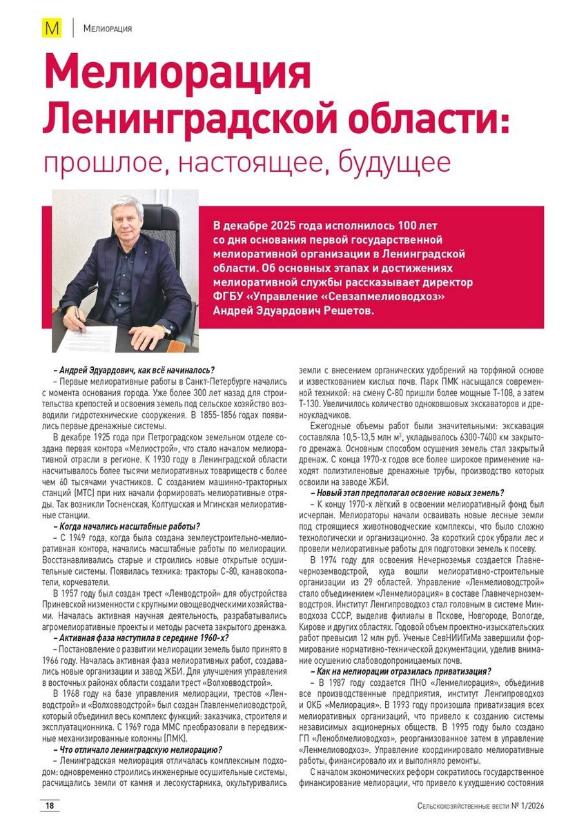 Директор ФГБУ «Севзапмелиоводхоз» Андрей Эдуардович Решетов рассказал об основных вехах истории и сегодняшнем дне Учреждения. https://agri-news.ru/zhurnal/2026/1-2026/melioratsiya-leningradskoy-oblasti-proshloe-nastoyashchee-budushchee/