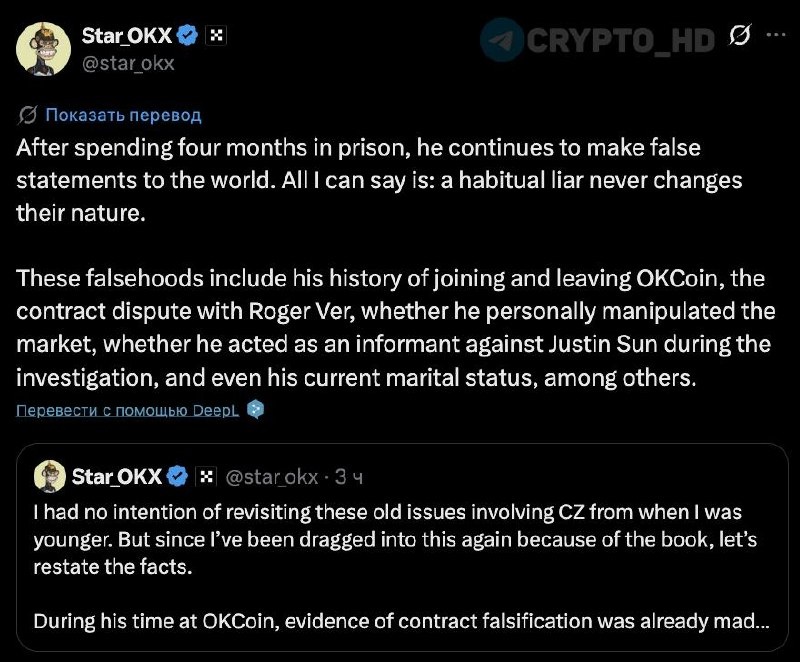 После выхода книги Чанпэна Чжао «Freedom of Money» CEO OKX публично обвинил его во лжи и напомнил историю конфликта времен биржи OKCoin. ▪ Что пишет CZ в книге: • Работал CTO в OKCoin около 8 месяцев. • Ушел из-за несоответствия ценностей. • Утверждает, что его долю (~10%) пытались сократить. • Отрицает подделку контракта с Роджером Вером. • Заявляет, что обвинения против него – ложь. • Допустил, что его аккаунтом мог воспользоваться другой сотрудник OKCoin и именно он мог отправить или подделать переписку. ▪ Версия CEO OKX: • Называет CZ «патологическим лжецом». • Говорит, что книга искажает события 2014-2015 годов. • Ссылается на старое видео с «доказательствами» подделки контракта с Роджером Вером (версии v7 и v8). • Утверждает, что файлы отправлялись с аккаунта CZ. • Также обвиняет его в манипуляциях рынком и «информаторстве». ▪ Контекст: • Конфликт начался после ухода CZ из OKCoin. • Тогда его обвинили в подделке контракта, но он это отрицал. • В спор была вовлечена и He Yi (со