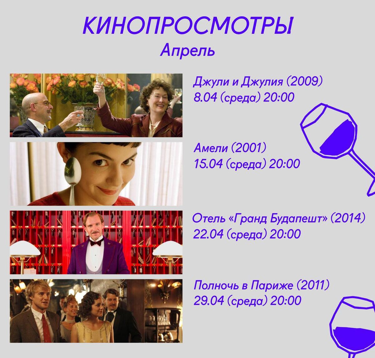 🍷🎬 Теперь каждую среду здесь показывают любимые фильмы команды — атмосферные, красивые и идеально подходящие под бокал вина. Апрельская программа: • «Джули и Джулия» • «Амели» • «Отель „Гранд Будапешт“» • «Полночь в Париже» Вход свободный, но лучше заранее забронировать столик — места разбирают быстро. 📍 ул. Октябрьская, 11 💬 МАХ