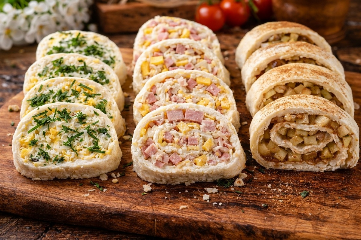 С закусками на столе всегда одна и та же история: вроде бы всего много, а запоминается обычно что-то одно. Причём это не всегда сложные блюда. Чаще наоборот — аккуратное, удобное, которое легко взять, попробовать и незаметно потянуться за следующим кусочком. И вот такие рулетики как раз попадают в эту категорию. Сначала их берут просто из интереса, потом возвращаются ещё раз, а потом уже спрашивают, из чего они сделаны и как их повторить дома. В какой-то момент начинаешь понимать, что дело не только в самом тесте, а в сочетании текстуры и начинки, которое даёт тот самый результат, ради которого такие рецепты и сохраняют. Творожное тесто даёт одну важную вещь — мягкость без тяжести. Оно не сухое, не плотное, при этом хорошо держит форму и не распадается. И именно поэтому рулетики получаются удобными: их можно подать как закуску, взять руками, разложить на стол. Но главный плюс — это вариативность. Один и тот же рецепт, а вкусы получаются совершенно разные. На 3–4 порции: • творог 300 г