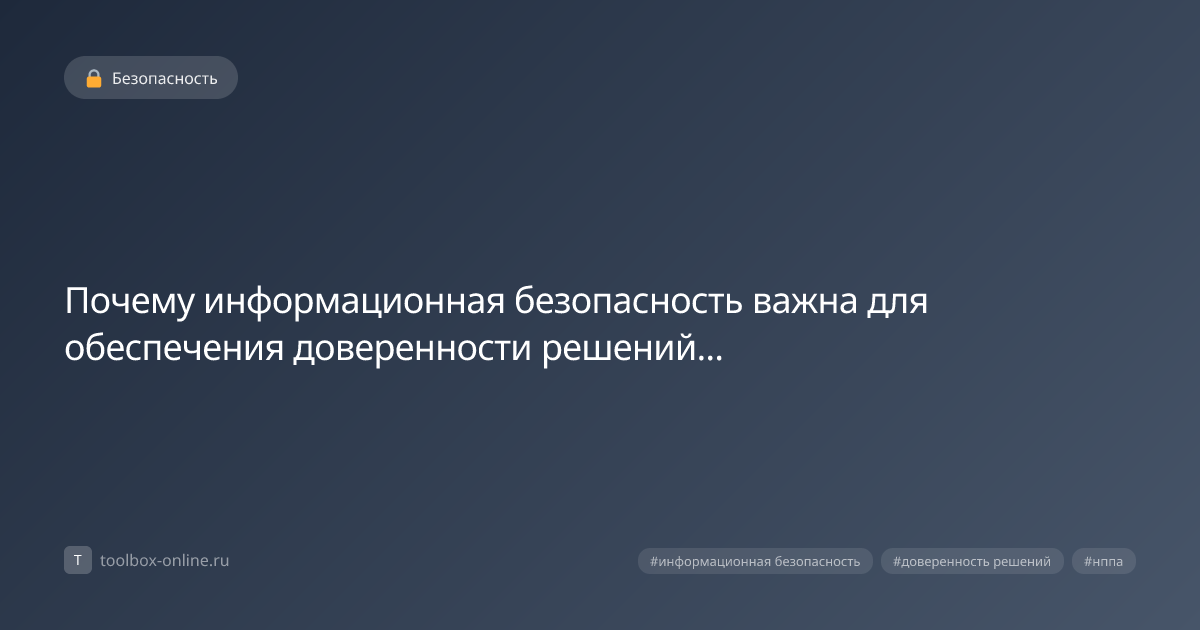 Информационная безопасность гарантирует доверенность решений НППА, защищая данные от утечек и манипуляций. При надёжных защи́тных мерах уровень доверия повышается до 92 % по данным 2026 года, а риск компрометации снижается до 1,3 %. Обеспечить доверенность можно через многоуровневую аутентификацию, шифрование данных и регулярный аудит. Прозрачность повышает доверие к решениям, так как позволяет контролировать каждый этап обработки данных. При обнаружении уязвимости необходимо сразу выполнить план реагирования. Существует множество бесплатных онлайн‑инструментов, позволяющих автоматизировать контроль. Эффективность измеряется через набор KPI, отражающих снижение рисков и повышение устойчивости. Воспользуйтесь бесплатным инструментом SecurityAudit на toolbox-online.ru — работает онлайн, без регистрации.