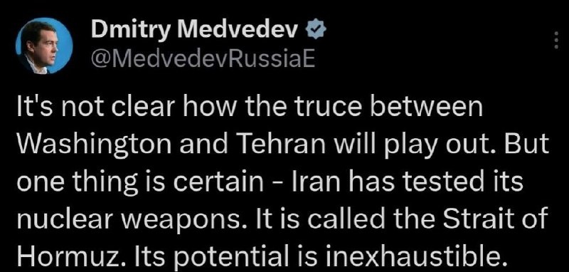 Պարզ չէ, թե ինչպես կզարգանա Վաշինգտոնի և Թեհրանի միջև հրադադարը», - ասել է Ռուսաստանի Անվտանգության խորհրդի փոխնախագահ Դմիտրի Մեդվեդևը