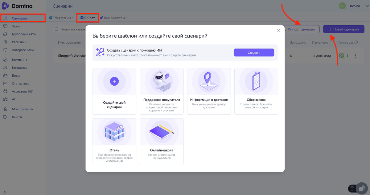 Команда Domino CRM продолжает развивать наш мультиканальный конструктор чат-ботов для бизнеса. В новой версии появилась поддержка ВКонтакте, которая дополняет уже доступные Telegram и веб-виджеты. В нынешних условиях бизнес должен работать сразу в нескольких каналах, и теперь управлять коммуникацией с клиентами стало еще проще. Все можно настроить внутри Domino CRM. Теперь в системе можно создавать и запускать чат-ботов для сообществ ВКонтакте. Это позволяет автоматизировать общение с клиентами прямо в социальной сети: отвечать на вопросы, принимать заявки и отправлять сообщения. Для ботов доступны готовые шаблоны сценариев, которые можно быстро адаптировать под задачи бизнеса. Среди них: Также можно создавать собственные сценарии с нуля, импортировать готовые или поручить их генерацию ИИ. Сценарии в VK позволяют строить диалоги с пользователями через: Все ответы пользователей сохраняются в системе и могут использоваться в дальнейших сценариях или аналитике. Кроме того, бот может отпра
