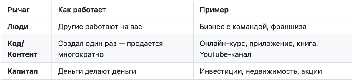 Ключевая идея: Если хотя бы один рычаг = 0, весь результат стремится к нулю. Пример: Вы гений (навыки 10/10), работаете в растущей нише (тренд 10/10), но не используете код/контент для масштаба (0) → доход ограничен вашим личным временем.