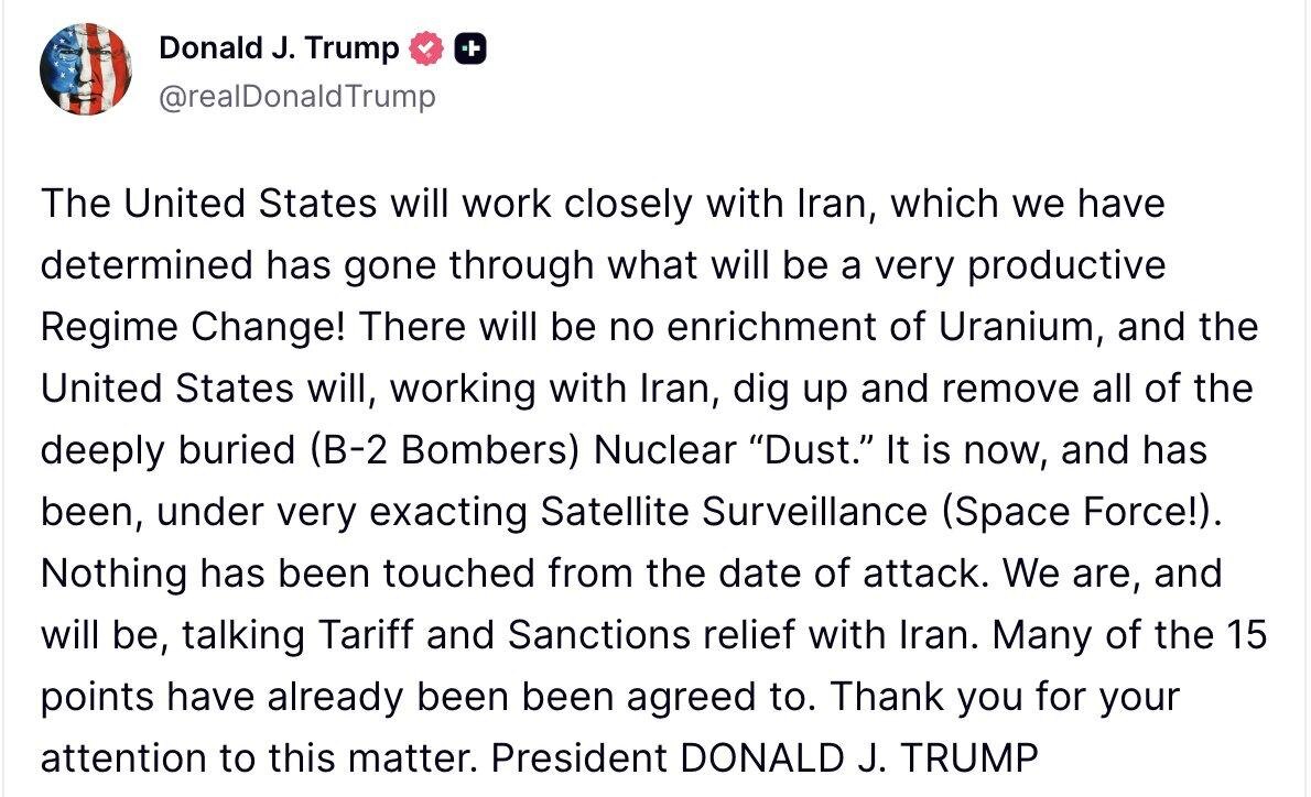 ։ Ուրանի հարստացում չի լինի, և ԱՄՆ-ն, համագործակցելով Իրանի հետ, կփորի և կհեռացնի խորը թաղված միջուկային «փոշին»։ Մենք Իրանի հետ բանակցություններ ենք վարում և կքննարկենք սակագների և պատժամիջոցների մեղմացման մասին։ 15 կետերից շատերի շուրջ արդեն համաձայնություն է ձեռք բերվել։ Դոնալդ Թրամփ