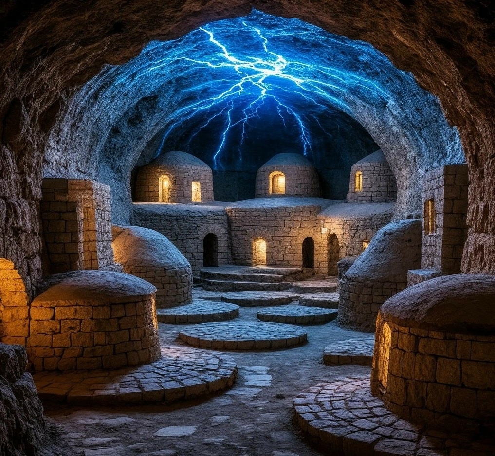 Перед их взором предстало множество круглых домиков, поразительно напоминающих земные юрты. Только эти домики были каменными. Их основания были сложены из плоских речных камней, скрепленных темной глиной, а купола обтянуты плотной тканью. Эти "юрты" были расставлены без всякого порядка: они теснились группами вокруг самых ярких светоносных жил, образуя извилистые улочки, которые повторяют изгибы пещеры. А ещё возле каждой группы "юрт" находились тоннели.