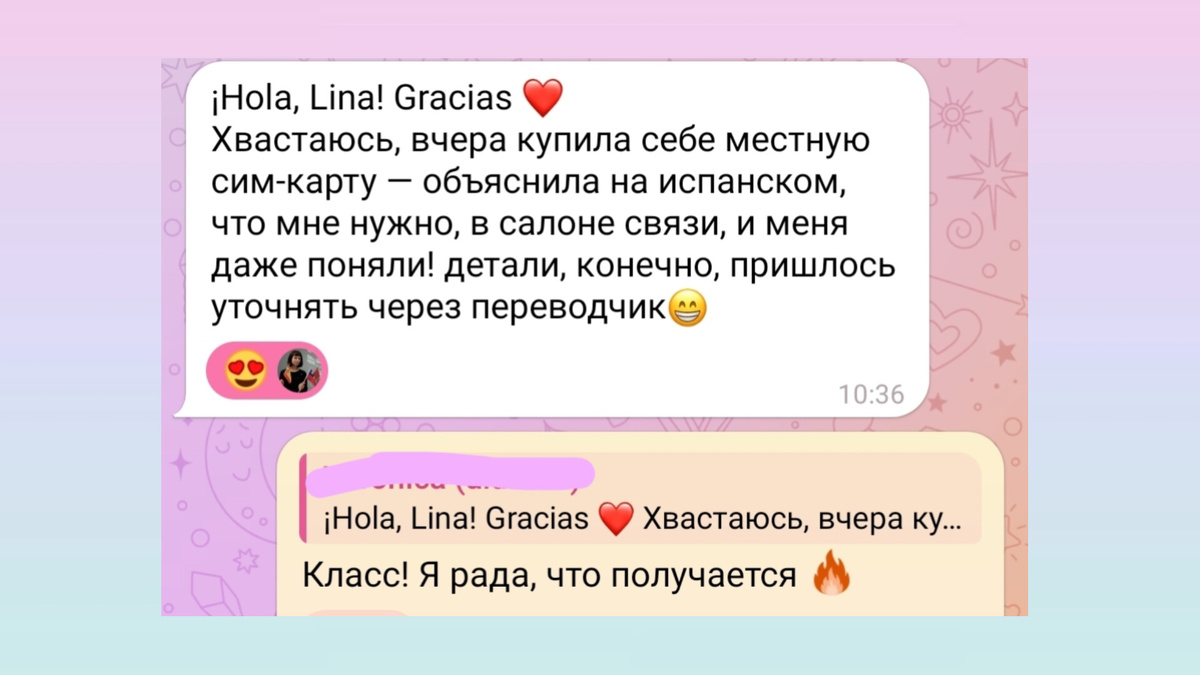 Раньше у неё был небольшой опыт изучения испанского, потом перерыв несколько месяцев. А затем она пришла ко мне заниматься асинхронно.