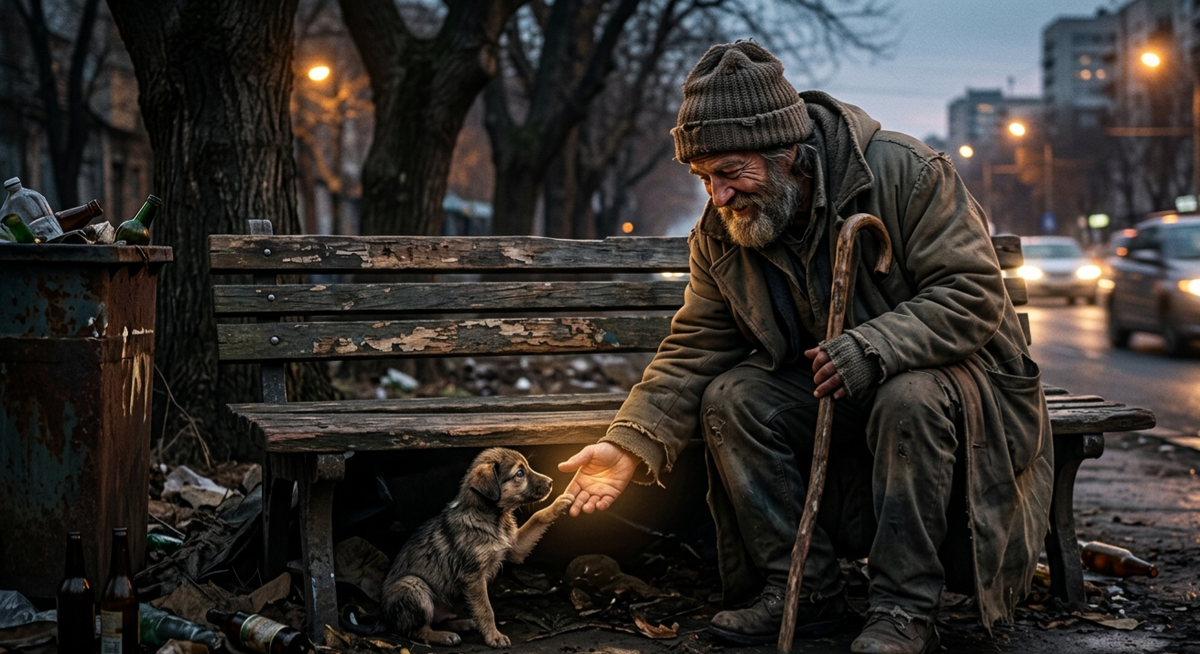 Под лавкой дрожал щенок — маленький, грязный, с глазами, в которых уже поселилась взрослая усталость. Он пытался не скулить, но живот предательски урчал.