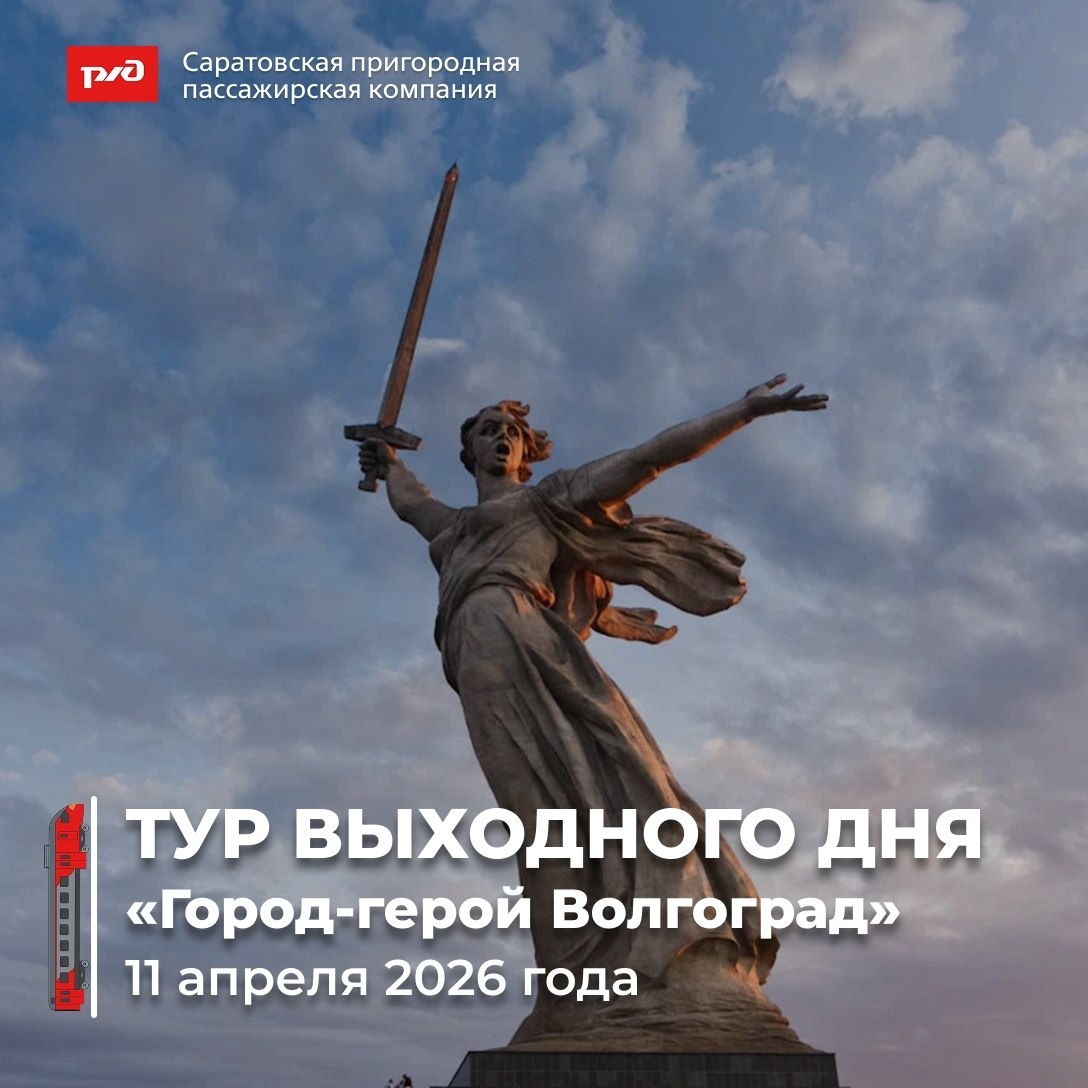 ! Отправляйтесь в незабываемое путешествие 11 апреля 2026 года на электропоезде и прикоснитесь к истории города-героя. Всего пять часов в пути – и вы окажетесь в самом сердце Волгограда, где вас ждет насыщенная программа: ▶️Величественный Мамаев Курган, место ожесточенных сражений, где пройдет пешеходная экскурсия ▶️Обзорная автобусно-пешеходная экскурсия по городу с посещением знаковых мест: "Орудия Победы", руины мельницы Гергардта - здание, сохранившееся со времен Сталинградской Битвы, дом сержанта Павлова, фонтан "Танцующие дети", площадь Павших Борцов, Вечного Огня, Тополя Победы, Аллеи Героев ▶️ Музей-панорама "Сталинградская битва" (билеты не входят в стоимость экскурсии) 🚆 Поездка на электропоезде – это комфорт и удобство, а наша экскурсионная программа позволит вам максимально эффективно использовать время и узнать много нового. 🕓 Расписание: - время отправления ЖД Вокзал, г. Саратов 06:38 (время местное) - время прибытия о.п. Мамаев Курган, г. Волгоград 10:50 (время мо