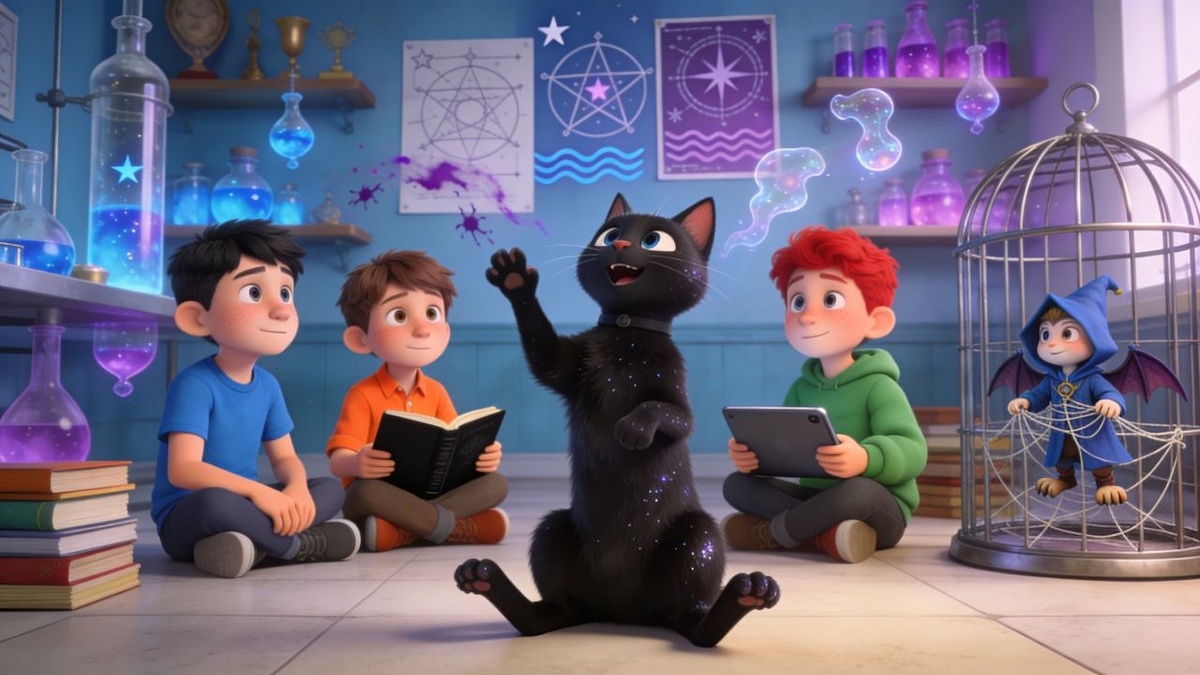 Все тихо окружили Черныша, присаживаясь прямо на пол. В комнате ещё висел запах гари и острого запаха эликсиров, но теперь в ней чувствовалось другое — напряжённое, любопытное ожидание - казалось, именно кот держит в лапах ключи к тому, что происходит вокруг.