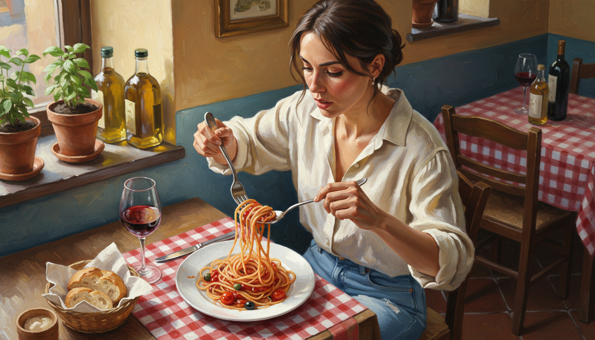 Я была уверена, что умею есть пасту. Двадцать лет практики — за кого вы меня принимаете? И вот я сижу в маленьком ресторане в Неаполе, передо мной тарелка спагетти алла путанеска, а официант смотрит на мою ложку так, словно я только что достала её из кармана пальто, а не взяла со стола. Оказывается, я делала это неправильно всю сознательную жизнь. Паста — это не просто еда в Италии. Это культурный код, свод правил, которые не записаны нигде, но нарушение которых замечают сразу. И самое странное: правила эти существуют не для удобства едока, а как своего рода опознавательный знак — свой или чужой. Начнём с главного парадокса. Ложка при поедании спагетти воспринимается итальянцами как инструмент для детей и иностранцев. Именно в таком порядке. Малышам разрешают накручивать спагетти с опорой на ложку или вовсе резать их на части — потому что мамам жалко стирать рубашки в томатных пятнах. Но взрослый человек с ложкой — это как взрослый человек с нарукавниками. Технически функционирует. Но