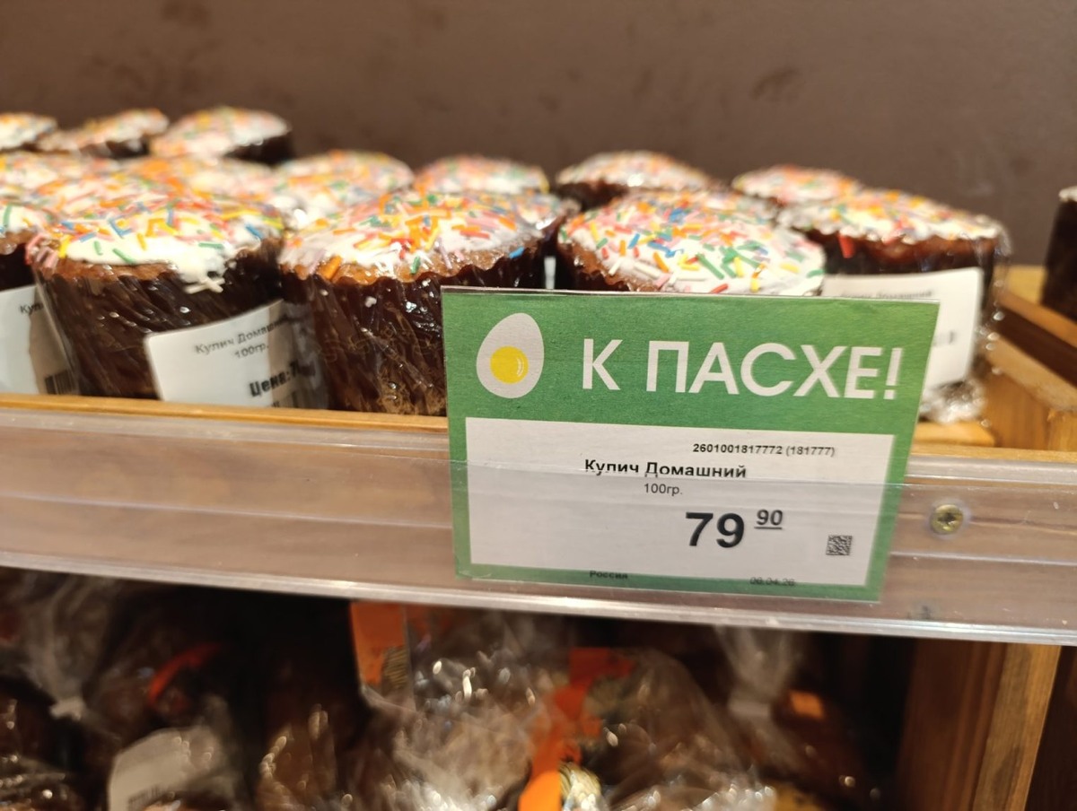 Витрины в Костроме уже заполнены пасхальной выпечкой. Журналист K1NEWS по традиции прошелся по костромским магазинам, чтобы узнать: а что с ценами? В прошлом году самый маленький куличик весом 100–130 граммов стоил от 50 до 65 рублей. Средний кулич весом 220–350 продавали за 119–499 рублей, а гиганты на 500–650 граммов пугали ценниками от 599 до 3000 рублей. Ценник этого года удивил диапазоном. Например, самые маленькие 100-граммовые куличики мы нашли за 80 рублей. Чуть больше — 125 граммов можно купить за сумму до 129 рублей. Кулич весом 250 граммов стоит уже от 123 до 271 рубля. Если присмотреться к вариантам на 350 граммов, то цены колеблются от 200 до 315 рублей. А вот куличи весом 450 граммов — от 280 до 779 рублей. Полкило почти за 800 рублей — цена весьма кусачая! Кулич весом 550 граммов можно найти за 350 рублей. А в некоторых магазинах за 700 граммов в среднем просят 500 рублей — это можно считать приятным сюрпризом. И наконец, самые крупные куличи, весом 900 граммов, продаютс
