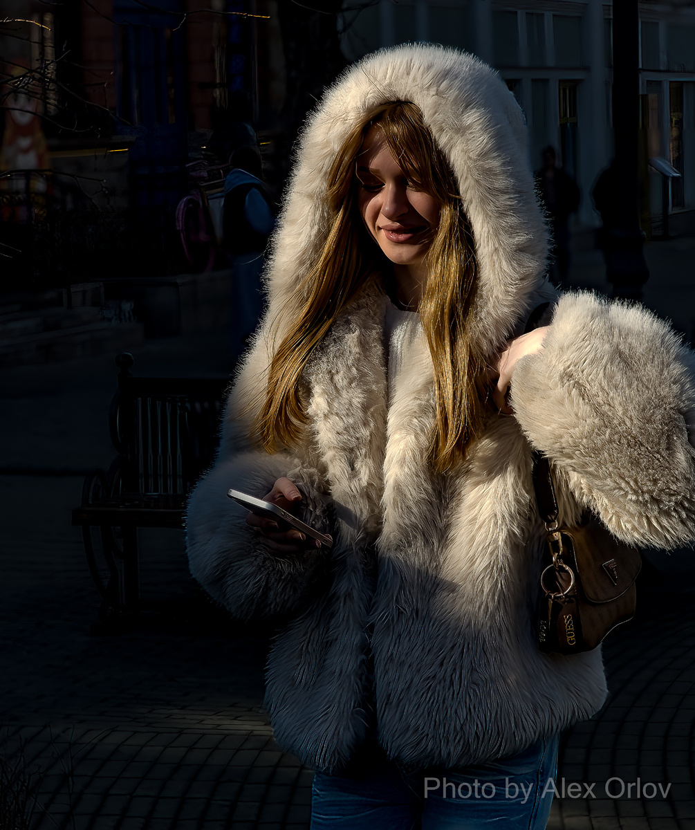 Здравствуйте уважаемые подписчики и читатели канала. Большое спасибо за ваше внимание к моему творчеству. Выходя на улицу с камерой, как правило предварительно строю приблизительный план. Что будет у меня в кадре, на что обращать внимание. А бывает, что и плана никакого нет. Все по наитию. Первый кадр определяющий. Так получилось и в этот раз. Вечерний свет скоротечен, успевай подмечать и предугадывать. Только достал и отстроил камеру. И сразу... Солнце в промежутках между надстройками на крышах домов, а навстречу интересная девушка в шубке. Ну как интересная? Свет интересно осветил. Заметил, дождался следующего момента, когда выйдет из тени и нажал на спуск. Однако две - три секунды решили многое. Девушка успела опустить головку, хотя до этого подбородок был чуть выше и лицо правильнее освещено. Жаль конечно. Тем не менее этот кадр натолкнул на мысль поснимать в контровом или заднебоковом свете. Половить блики. Первый кадр снят. Продолжаю. Буквально сто метров вниз по улице и новый
