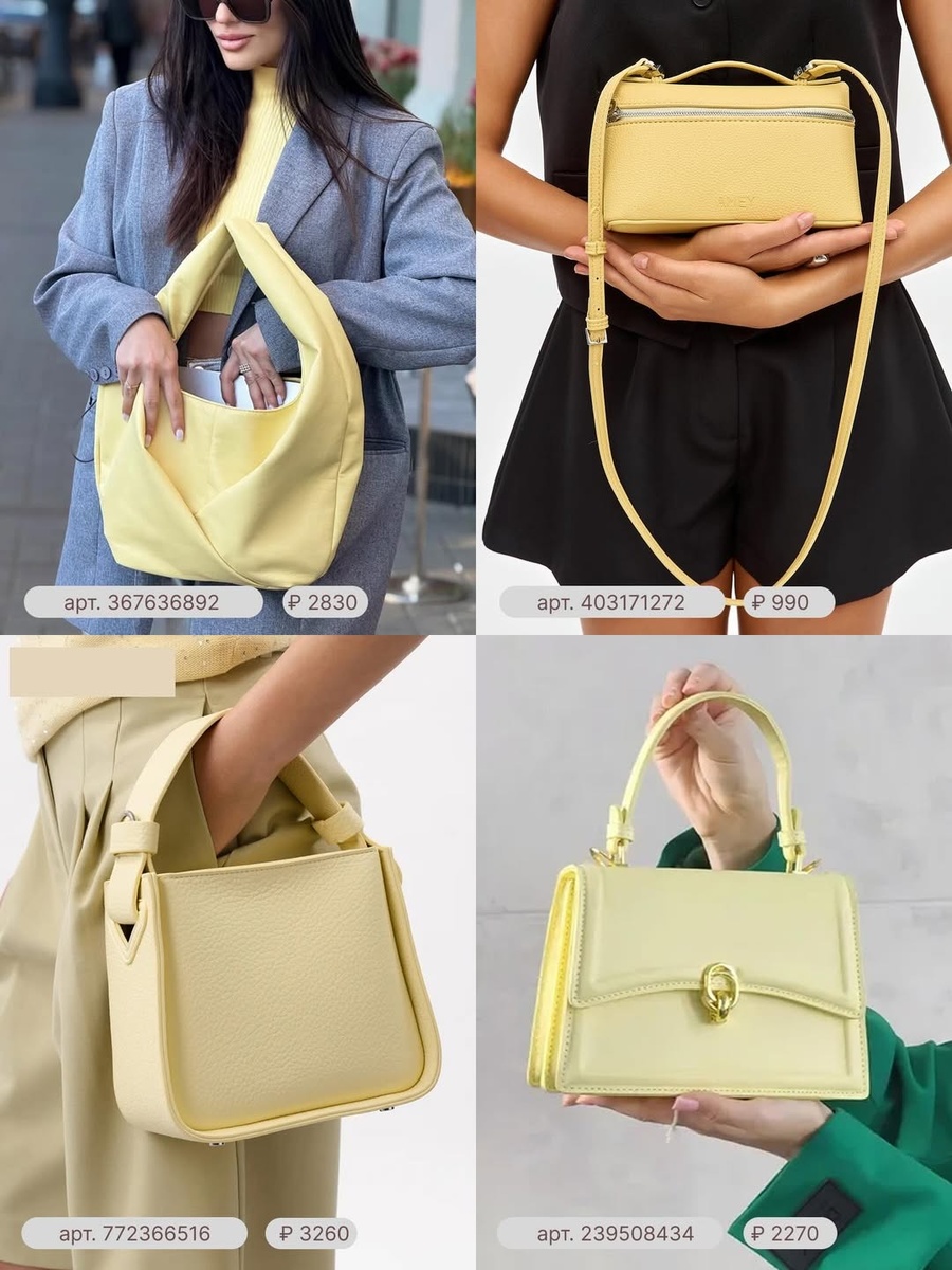 Сумка — это не просто вещь для повседневных мелочей. Это жест, линия, настроение, характер образа. Именно она нередко становится главным акцентом, который собирает весь комплект и делает его законченным. В этой подборке особенно хорошо видно, как сильно работают оттенки и фактуры: сливочно-жёлтые модели добавляют мягкий свет, оливковые — глубину и благородство, а небесно-голубые — свежесть, чистоту и лёгкость.