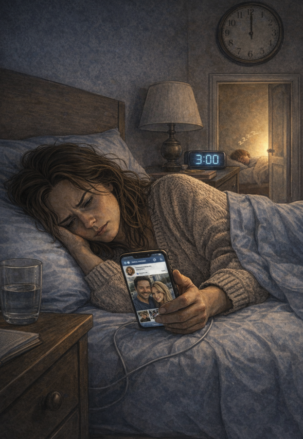 Три часа ночи. Сын спит за стенкой, она слышит его дыхание сквозь закрытую дверь - и всё равно лежит с телефоном в руках.