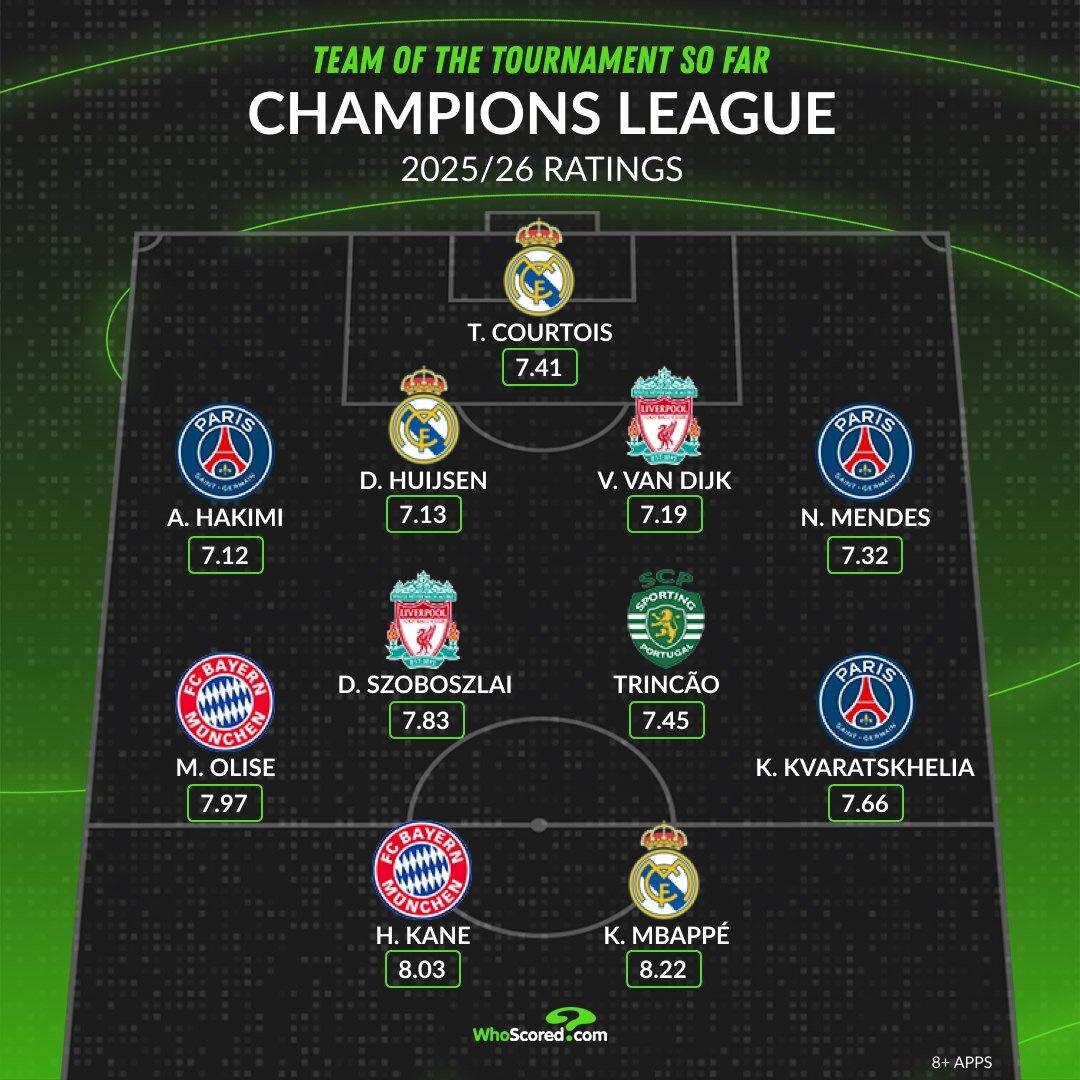Символическая сборная этого розыгрыша Лиги Чемпионов по оценкам WhoScored (до начала 1/4 финала) ☝️