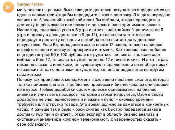 : раньше было так: дата доставки покупателю определяется из одного параметра: когда Вы передадите заказ в доставку. Эта дата передачи зависит от 3 значений: какой таймслот Вы выбрали, когда передадите в доставку (в день заказа или позже) и до какого часа принимаете заказы. Например, если заказ упал в 8 утра и стоит в настройках "принимаю до 9 утра и приеду в день доставки с 9 до 12), то озон считает что заказ передадут в доставку сегодня и с этой даты он считает дату доставки покупателю. Если Вы передадите заказ позже 12 часов, то озон начислял штраф согласно индексу за просрочки и отмены. Как теперь: озон добавил еще один штраф 50 и 100 руб если отгружаться вне слота, т.е. если слот выбран с 9 до 12, то сдавать нужно четко до 12 и никак иначе. И этот штраф никак не связан с индексом, он существует параллельно и он вообще никак не зависит от даты доставки покупателю, т.к. она определяется по другим параметрам. Почему так произошло: менеджмент в ozon явно недавняя школота, которая