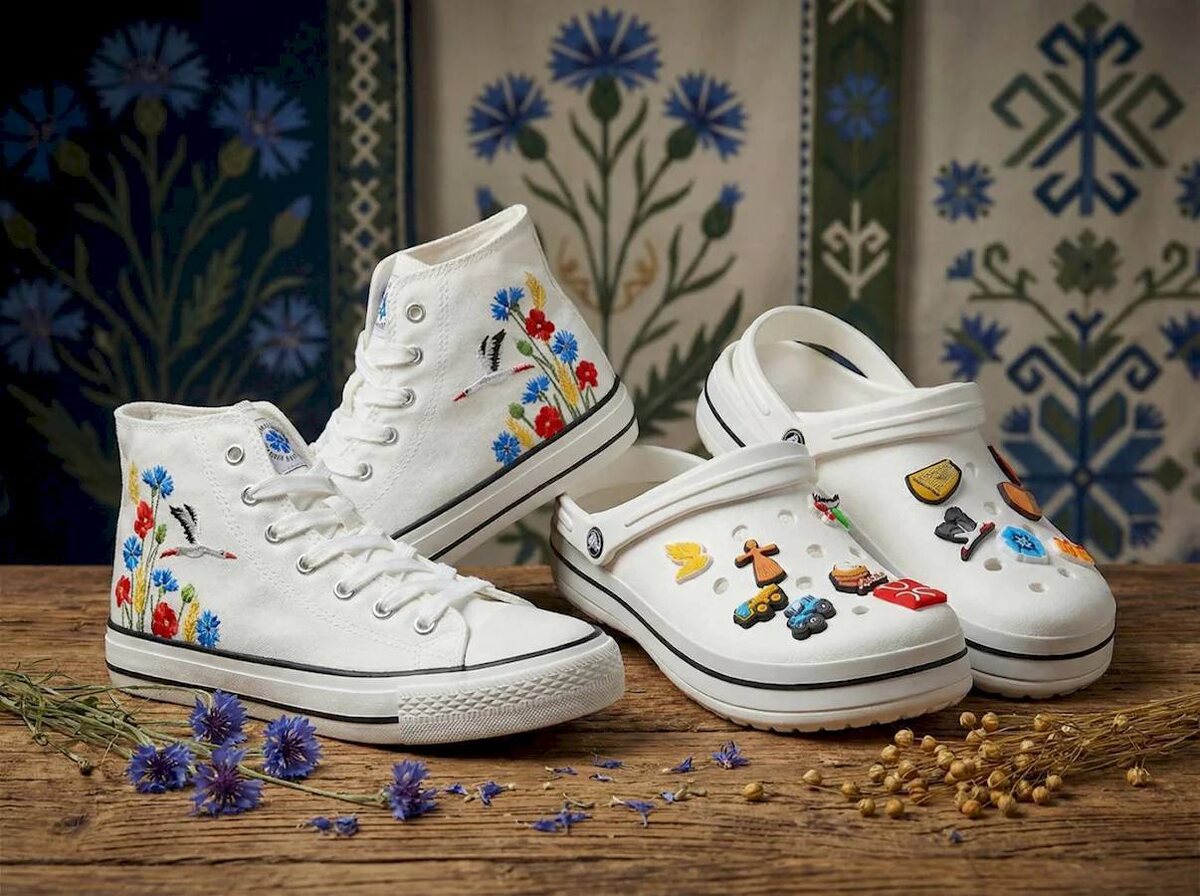 В самой патриотичной линейке: • Кроксы с драниками, сметанкой, трактором, колосками, аистом и буханкой ржаного хлеба • Две модели кед с васильками и аистом • Носки с аистом • Шопперы с цветами и аистом Оригинальные кроксы и рядом не стоят с этой белорусской имбой