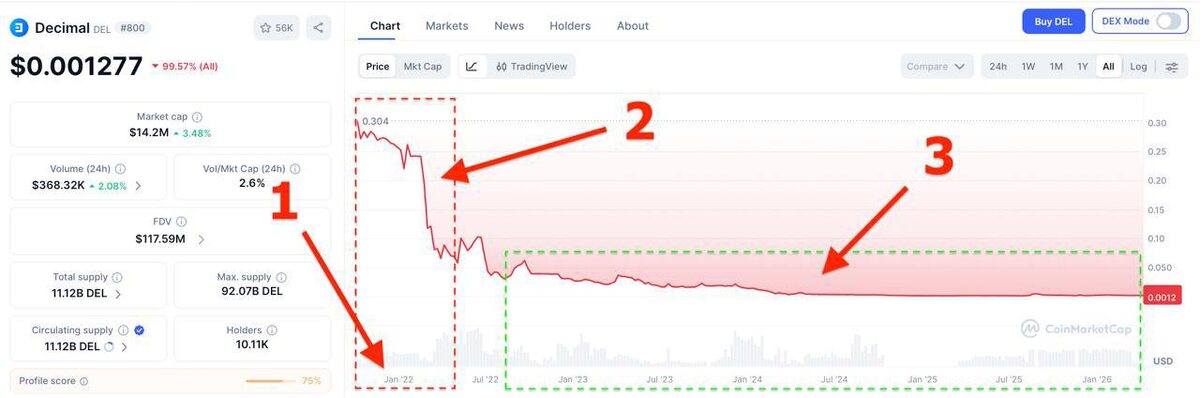 ) Теперь давайте посмотрим на ситуацию не глазами “хомяка”, а более трезво - с позиции крупного игрока. Начнём с самого графика. 🖤 Первое, на что стоит обратить внимание он начинается с отметки около 0.3$ в январе 2022 года. Но сама монета появилась ещё в 2020 году. Возникает логичный вопрос: где на графике эти два года? Если разобраться, становится понятно - полноценный листинг DEL произошёл только в 2022 году. К этому моменту команда уже проделала большую работу: сформировала аудиторию, собрала средства на листинг, начала закладывать бюджеты на выход на биржи. До этого момента торги уже шли, но на ограниченном количестве площадок, а пользовательская база росла органически и достигала десятков тысяч человек - без агрессивного маркетинга и вливаний. Это важный момент, потому что Decimal изначально развивается без привлечения фондов и инвесторов. Всё делается за счёт собственных средств. А это означает, что значительная часть ресурсов уходит на содержание команды. Если говорить