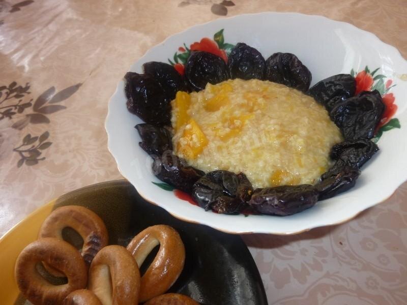 Нам нужны продукты: Тыква 300гр, пшеничная каша 2 стакана, вода 4 стакана, соль 1 по вкусу, масло подсолнечное 1 ст. ложка, мед 1 ст. ложка.