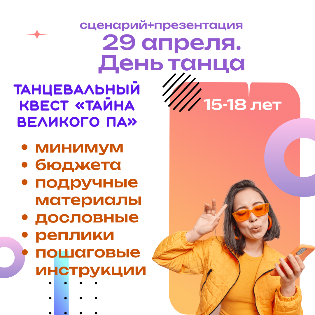 Знакомство с культурой разных стран через движение, музыку и истории. Формат развивает эмпатию, расширяет кругозор и вовлекает даже стеснительных студентов. 2. Для 15–18 лет: танцевальный квест «Тайна Великого Па» с презентацией