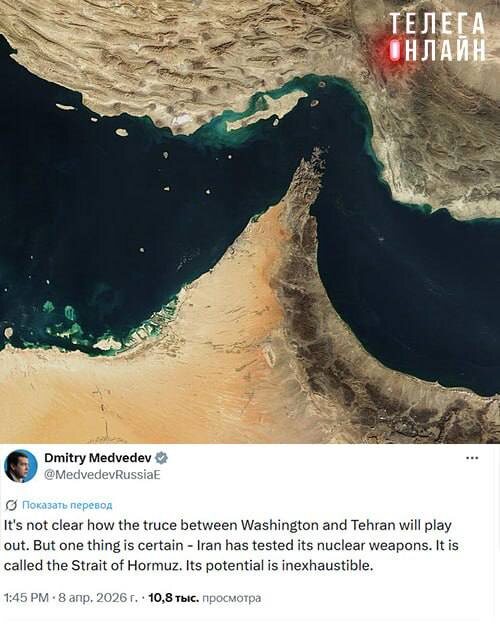 Дмитрий Анатольевич не верит в перемогу Трампа: Неясно, как будет развиваться перемирие между Вашингтоном и Тегераном. Но одно очевидно — Иран испытал свое «ядерное оружие». Оно называется Ормузский пролив. Его потенциал неисчерпаем. Впрочем, мы знаем одну нацию, выкопавшую Черное море, — можно подрядить их закопать пролив. 🚲 Подпишись на Телега Online