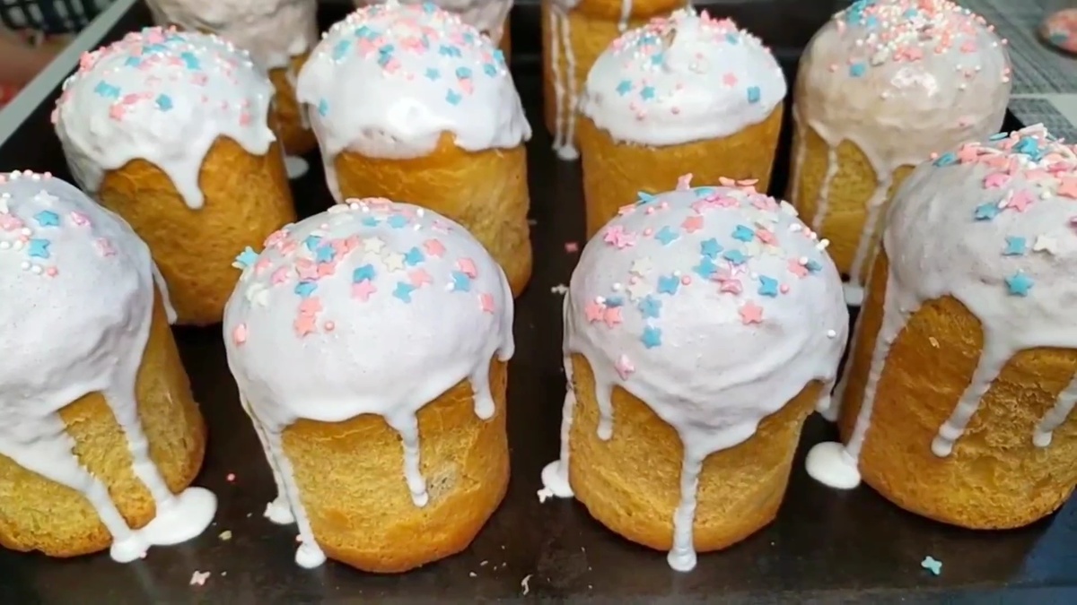 Для украшения я смешала обычную, белую глазурь в порошке с водой до нужной консистенции. Обмакнула остывшие куличи в глазурь, сверху посыпала кондитерской посыпкой.