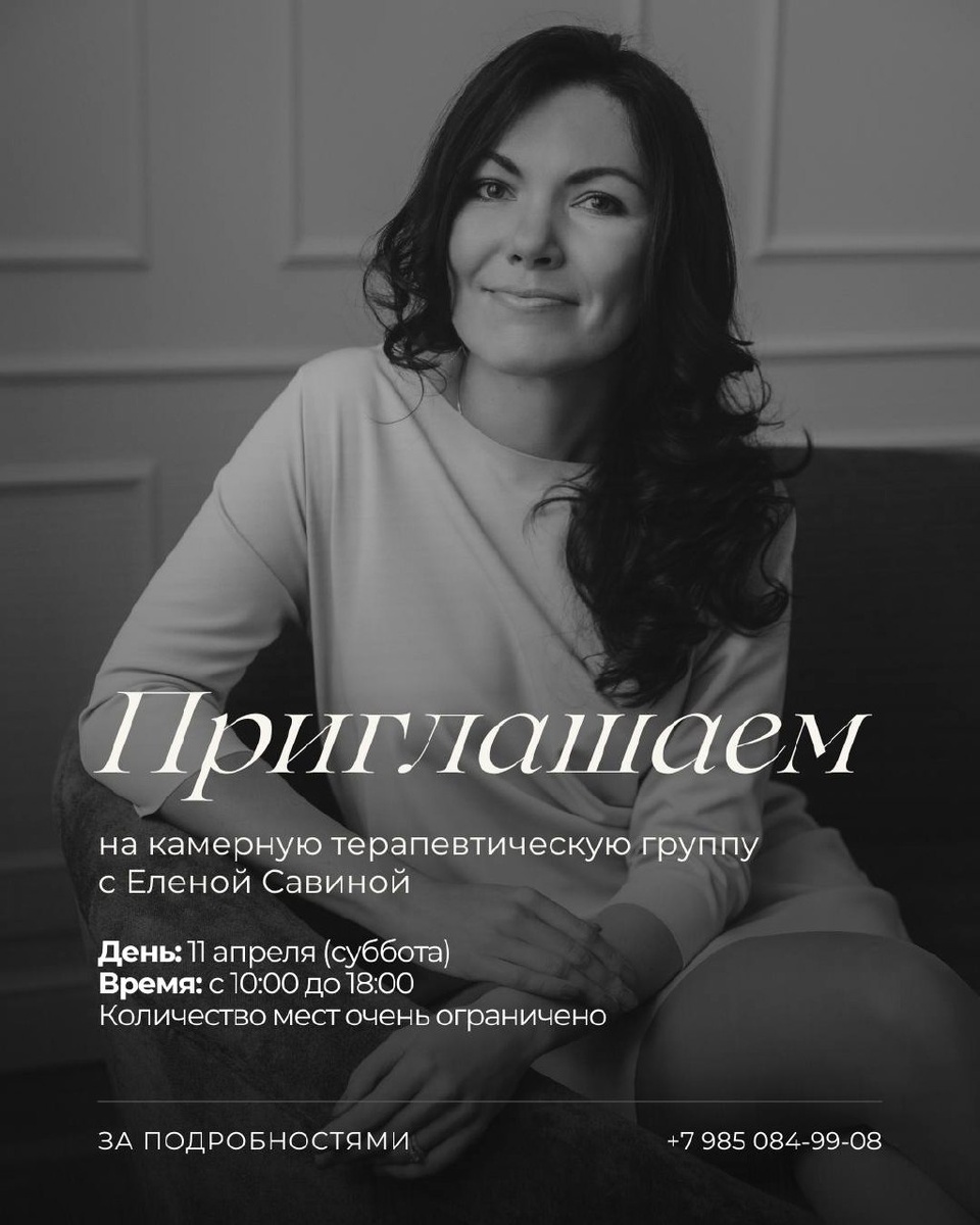 ! Открыта запись на очные форматы работы с Еленой Савиной в Москве. ▫️ 11 апреля (суббота), 10:00–18:00 Камерная группа «Как хочет женщина». Закрытый формат с ограниченным количеством участниц. Это пространство, где можно глубоко и бережно исследовать свою женскую и сексуальную энергию, получить внимание к своему запросу и работать в атмосфере доверия и поддержки. ▫️ Индивидуальные консультации (очно) 10–13 апреля — по предварительной записи. Подойдут тем, кто хочет личную встречу, более точечную и глубокую работу со своим запросом, а также тем, кто давно планировал попасть на очный формат к Елене. *Количество мест в группе ограничено. Для записи и подробной информации, пожалуйста, напишите нам в Директ. https://t.me/talk_to_me_psy