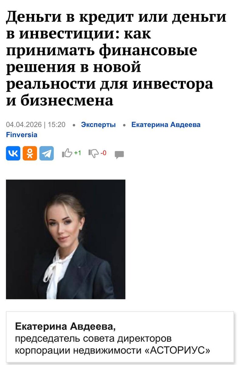 Дорогие подписчики, на «Финверсии» вышла колонка Председателя Совета директоров Корпорации недвижимости «АСТОРИУС» Екатерины Авдеевой о выборе между досрочным погашением кредитов и инвестициями в условиях высоких ставок. Главная мысль: это больше не вопрос привычек, а задача альтернативной стоимости капитала. Особенно остро она стоит для предпринимателей и инвесторов. Коротко — ключевые тезисы публикации 👇 📊 Базовая логика сегодня (ключевая ставка 15%): • Рыночный кредит (18–30%) → досрочное погашение даёт гарантированную «прибыль», равную его ставке. Это часто выгоднее консервативных вложений с учётом налогов. • Льготный кредит (2–6%) → возникает процентный арбитраж: деньги выгоднее нести на депозит (15–18%) или в ОФЗ. 🧠 Когда разумнее НЕ гасить кредит, даже если он дорогой? Ради ликвидности — чтобы не получить кассовый разрыв. Если бизнес приносит доходность выше ставки по кредиту (с поправкой на риски). При использовании налоговых льгот (ИИС-3, амортизация через юрлицо и т.д.).