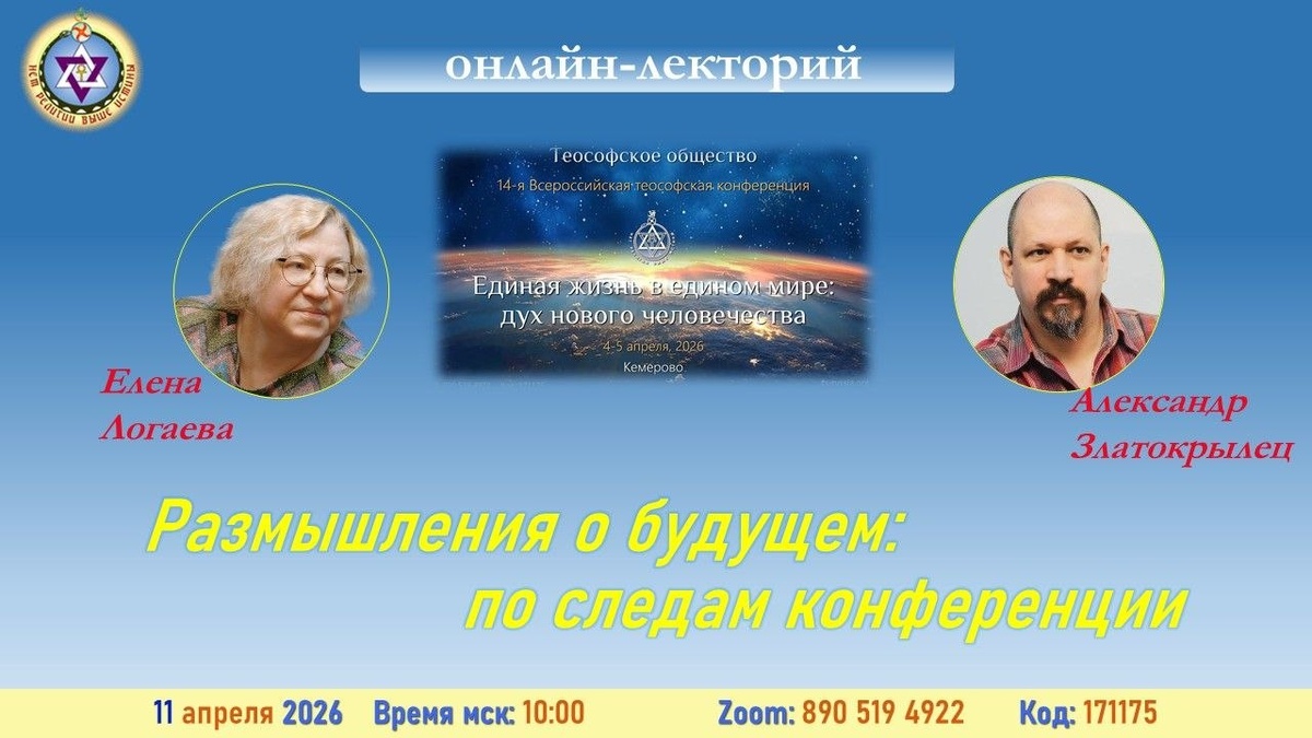 " Ведущие: Елена Логаева и Александр Златокрылец 🔔 ДАТА: суббота, 11 апреля 2026 г. Начало в 10:00 (время московское). ⏺️⏺️⏺️Вход в ZOOM: www.zoom.us Id: 890 519 4922 Pass: 171175 ⚡️Быстрый вход в лекторий по ссылке: https://clck.ru/37Q6hC 👉Предварительная регистрация и установка программ - не нужны. Участие - бесплатное. Включение вашей персональной камеры - не требуется. ‼️Все вопросы вы можете направить по адресу: secretary@ts-russia.org ☀️Добро пожаловать!