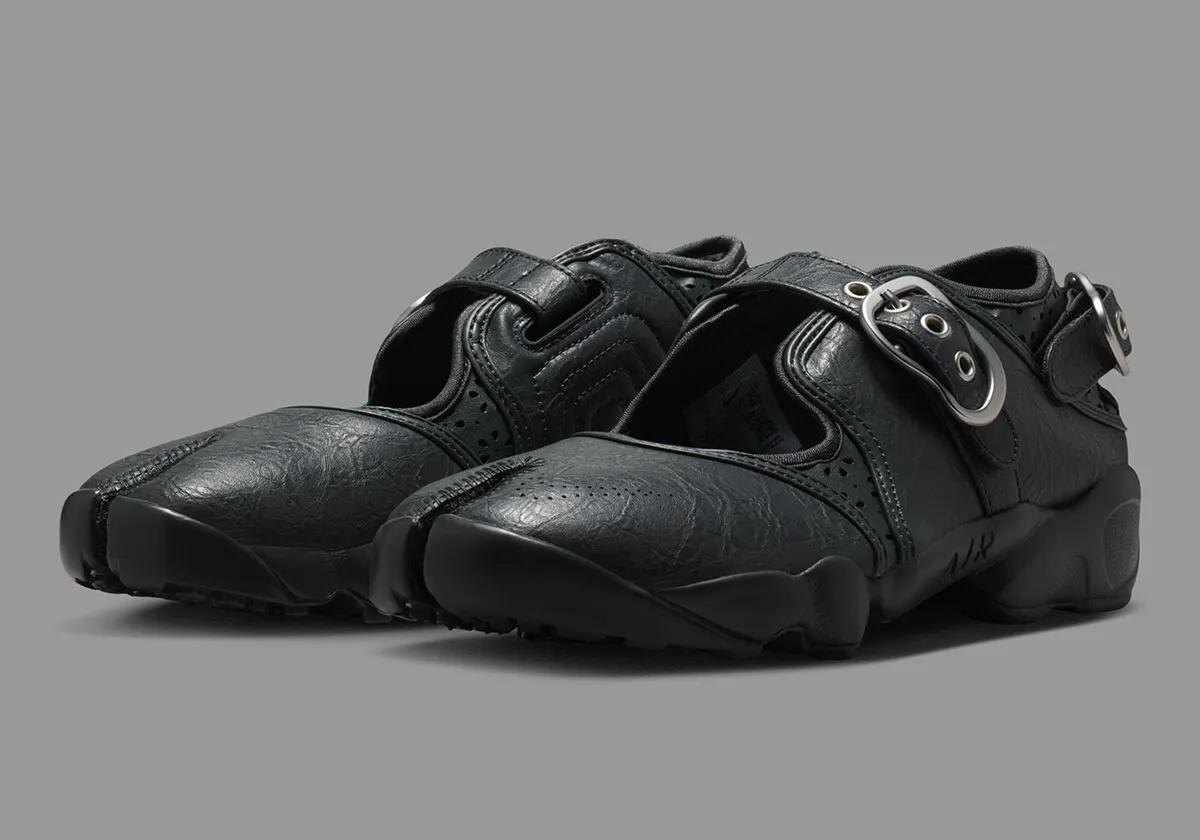 Версия “Grunge” уводит силуэт в грубую эстетику. Мятая кожа, перфорация и фирменный раздельный носок и акцент на деталях. Вместо велкро металлические застежки с пряжками, которые добавляют паре индустриального характера. Получился почти панковский Air Rift с вайбом Y2K и гранжа. Идеальная пара для прогулки на Цветном Бульваре в этом году?