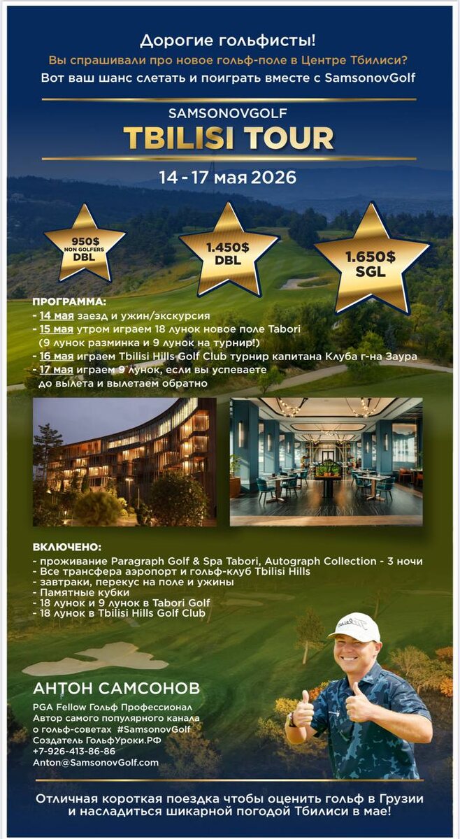 🥳 🆕 Вы спрашивали про новое гольф-поле в Центре Тбилиси? . Вот ваш шанс слетать и поиграть вместе с SamsonovGolf 🥳 . SamsonovGolf Tbilisi Tour . 1️⃣4️⃣ мая заезд и ужин/экскурсия . 1️⃣5️⃣ мая утром играем 18 лунок новое поле Tabori (9 лунок разминка и 9 лунок на турнир!) . 1️⃣6️⃣ мая играем Tbilisi Hills Golf Club турнир капитана Клуба г-на Заура . 1️⃣7️⃣ мая играем 9 лунок, если вы успеваете до вылета и вылетаем обратно! . ✅ Все трансфера включены, завтраки, перекус на поле и ужины + кубки + кары уже в стоимости. . Отличная короткая поездка чтобы оценить гольф в Грузии и насладиться шикарной погодой Тбилиси в мае! . Single - 1650 USD Double - 1450 - USD Double non golfer - 950 USD