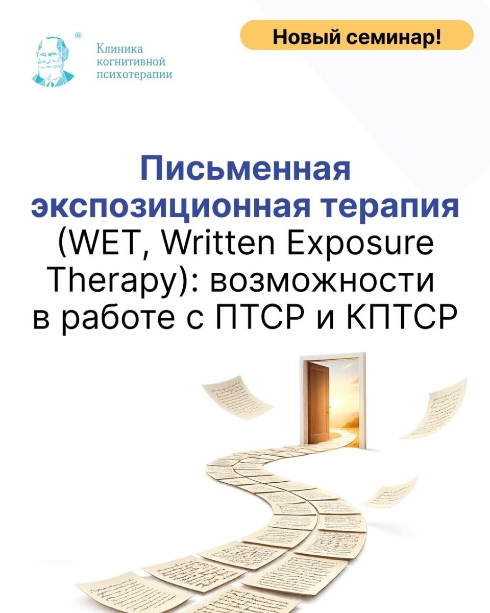 ! 🎓 Written Exposure Therapy: Письменная экспозиция при ПТСР и КПТСР Краткосрочный структурированный протокол экспозиционной терапии на основе систематического письменного воспроизведения травматического опыта 📚 Программа семинара: - Теоретическая модель WET - Структура протокола WET - Практическая работа терапевта - Показания и ограничения метода Ведущий семинара: Каменюкин Андрей Геннадьевич - Врач-психотерапевт, врач-психиатр, основатель и генеральный директор Клиники когнитивной психотерапии CBT Clinic, преподаватель CBT Clinic Education 🗓 16, 23 и 30 апреля с 18.00 до 20.30 по МСК Онлайн Доступ к записям на 2 месяца Стоимость 15 000 р. После окончания семинара выдается сертификат в электронном виде 🎓 👉 Подробнее https://cbtclinic.education/written-exposure-therapy2 📹 Запись прямого эфира "Письменная экспозиционная терапия (WET, Written Exposure Therapy): возможности в работе с ПТСР и КПТСР" доступна по ссылке https://cbtclinic.education/written-exposure-therapy