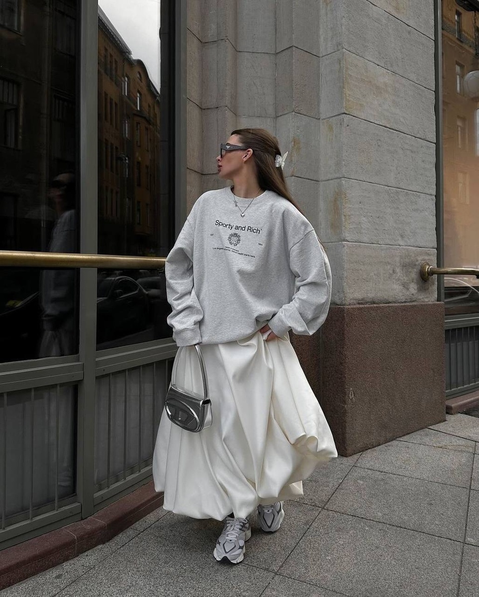 Оверсайз худи и белая юбка-баллон. На ноги – грубые кеды New Balance или кроссовки-тракторы. И обязательно белые высокие носки поверх колготок. Это образ для смелых, но он стреляет без промаха.