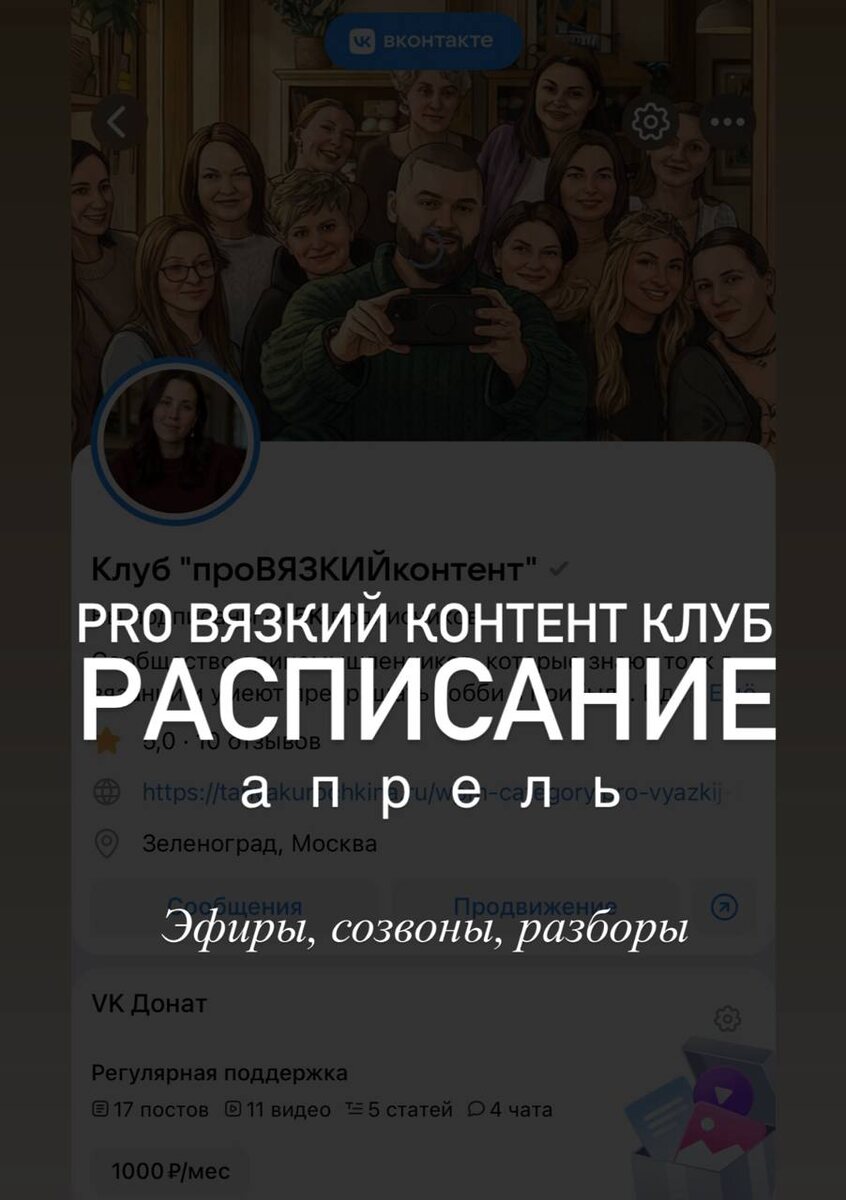! Посмотрите, какой на военный график встреч мы подготовили на апрель 😍 Чтобы иметь доступ ко всем материалам клуба в оформляйте подписку «клуб про вязкий контент» https://vk.ru/tanyakurochkina.proclub 📅 ГРАФИК МЕРОПРИЯТИЙ: АПРЕЛЬ для СООБЩЕСТВА ВК Неделя 1 (5.04 – 12.04) • 5.04 (Вс) 11:00 PRO эфир «Набор аудитории через видео» • 10.04 (Пт) 13:00 📢ВК эфир: Ответы на вопросы сообщества • 11.04 (Сб) 11:00 PRO эфир «Синдром самозванца: как он мешает зарабатывать» • 12.04 (Вс) Флешмоб: Пасхальные коллажи (формат 9х9) Неделя 2 (13.04 – 19.04) • 13.04 (Пн) 13:00 ВК эфир: Тематический разбор «Спицы» • 17.04 (Пт) 13:00 📢 ВК эфир: Ответы на вопросы сообщества • 19.04 (Вс) 11:00 PRO эфир «Первые продажи: мифы и реальность» Неделя 3 (20.04 – 26.04) • 20.04 (Пн) 13:00 ВК эфир: Обзор книги «Воротнички» + идеи • 24.04 (Пт) 13:00 📢 ВК эфир: Ответы на вопросы сообщества • 26.04 (Вс) 11:00 PRO эфир «Почему не покупают, если ты хорошо вяжешь?» Неделя 4 (27.04 – 30.04) • 27.04 (Пн