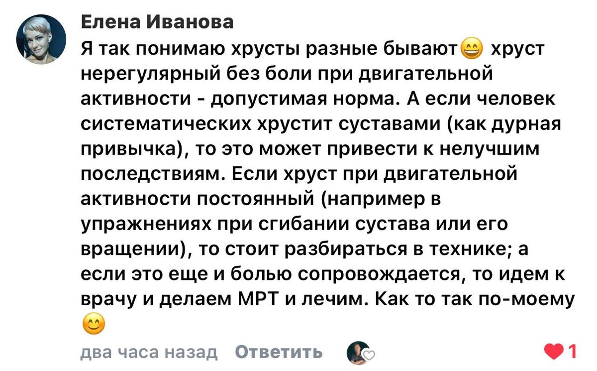 ? В прошлом посте мы выяснили, что мнения расходятся: кто-то говорит «норма», кто-то — «беда» 👉 Сам хруст — не проблема. Это действительно может быть просто выход газа из суставной щели. (Проверка- 1-2 щелчка после «засиженности или залеженности») Но! 👉 Проблема — ПОЧЕМУ вообще хочется хрустнуть. Вот что реально важно: • если спина «просит» хруста каждый день — это уже не норма • если после хруста становится легче — значит, есть скрытая скованность • если хруст сопровождается болью — это сигнал, что тело компенсирует • если хрустят одни и те же сегменты — другие участки просто не работают Тело — хитрое. Когда один отдел «ленится», другой начинает работать за двоих. И вот тогда появляется ощущение, что «надо щёлкнуть, чтобы отпустило»(наиболее частая причина) Но хруст — это не лечение. Это временное снятие напряжения, как перезагрузка компьютера, который всё равно зависает Что делать: • вернуть зажатому отделу подвижность • включить тазобедренные • научить диафрагму работать