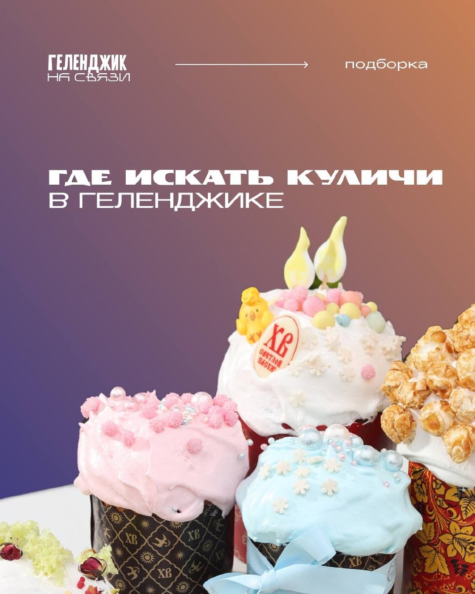 ? Собрали подборку сочных предложений в заведениях Геленджика Кафе Круассан и Кофе Классические куличи, а также с трендовой кремовой начинкой, с меренгой и творожная пасха Кафе Эль Пан Куличи в декоре аля Русь с леденцом без сахара. Рулеты с маком и корицей Кафе Крема Куличи в русском стиле с итальянской меренгой и шоколадом Кафе Лалли Модные куличи с дубайским шоколадом и сочной кремовой начинкой Кафе Миндаль Куличи с изюмом, творожная пасха, мамины рулеты с орехами и маком Ресторан Шато де Талю Пасха лимонная, тирамису и фисташка-малина. Также в ресторане состоится Пасхальный бранч 12 апреля в 12:00 Причал 93 Готовят панеттоне. Традиционный итальянский рождественский десерт с разными начинками: кофе, три шоколада, айва, черника, сыр, а также цукаты, вишня и апельсин Табрис Фирменные куличи, краффины и мини пасхальные десерты ➕Два бонусных события для подписчиков нашего медиа в МАХ