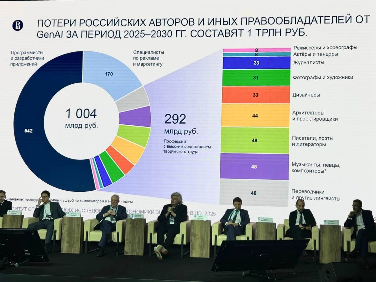 На пленарной сессии IPQuorum: Музыка «Авторы на службе AI», где мы находились 15 октября 2025 года, дискуссия получилась насыщенной и вышла далеко за рамки обсуждения исключительно музыкальной тематики. Среди главных проблем участники обсуждали снижение творческого участия человека в создании контента. Это может привести к эффекту «зараженного озера» — когда нейросети начнут обучаться на собственных генерациях, уходя в бесконечное самоповторение. Из интересного: По ссылке можно ознакомиться с исследованием медиа-эффекта Тилли Норвуд. Автор приходит к выводу: если киноиндустрия не выработает единую позицию по отношению к ИИ-технологиям, технологические компании смогут навязать свои стандарты. В этом случае традиционные студии окажутся в зависимости от правил, установленных ИИ-разработчиками. С этим трудно не согласиться — и именно такой процесс уже заметен на практике. Еще один важный момент отметил генеральный директор Ведомостей: сегодня ИИ-системы добровольно указывают источники и