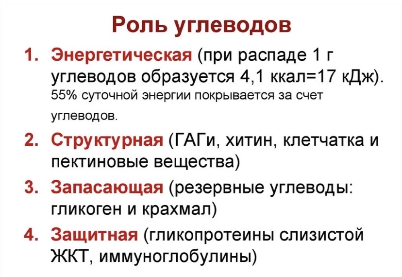 - Энергетическая. Углеводы — главный источник энергии для организма. При расщеплении они преобразуются в глюкозу, которая используется клетками для выработки энергии. Из 1 г углеводов образуется 4 ккал энергии. Углеводы обеспечивают до 50–60% всех энергозатрат тела.